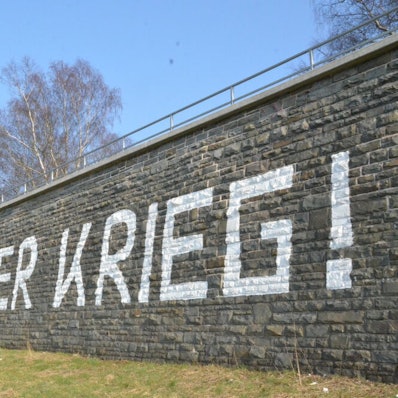 Statement gegen den KriegWaldbröler Friedensmauer angeleuchtet