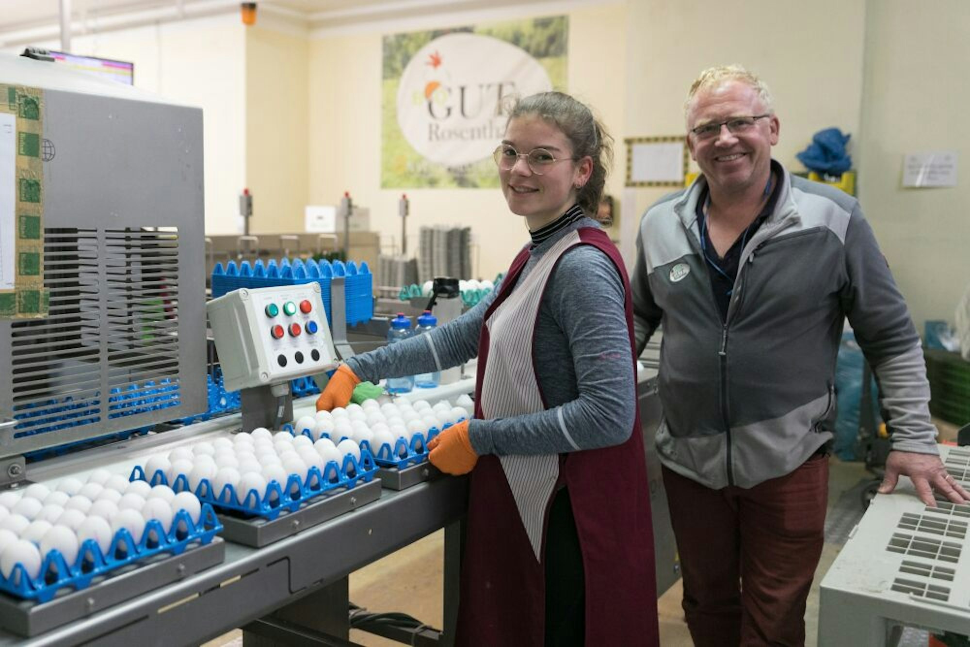Auf dem Bio-Gut Rosenthal in Bergneustadt muss Biobauer Henning Gauer für das Futter der Tiere in der aktuellen Krise einiges drauflegen. Sortiert werden die Eier unter anderem von Mitarbeiterin Lina Guterding.
