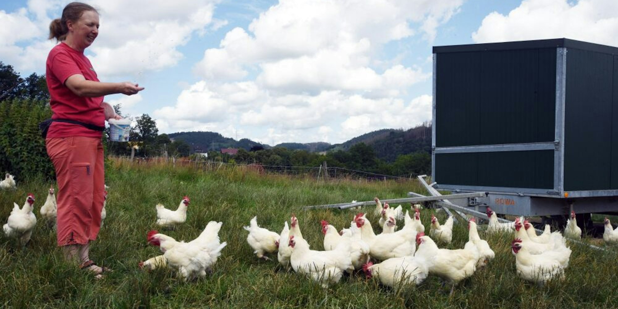Neben 20 Rindern, 20 Mutterschafen und zwei Kaltblutpferden halten die Bio-Bauern seit etwa acht Jahren auch rund 200 Hühner. Hybrid-Hühner mit einer Legeleistung von etwa 300 bis 330 Eiern im Jahr sind für die beiden jedoch tabu. Sie haben sich auf Rassehühner verlegt, von denen es nach Angaben von Schmidt etwa 180 Arten in Deutschland gibt. Sein Liebling ist der Bergische Kräher. Der Gummersbacher schilderte, dass die Bauern damit früher Hahnenkämpfe bei den Grafen von Berg ausgetragen hätten. Dem Gewinner habe ein Kotten mit einem Stück Land gewinkt.