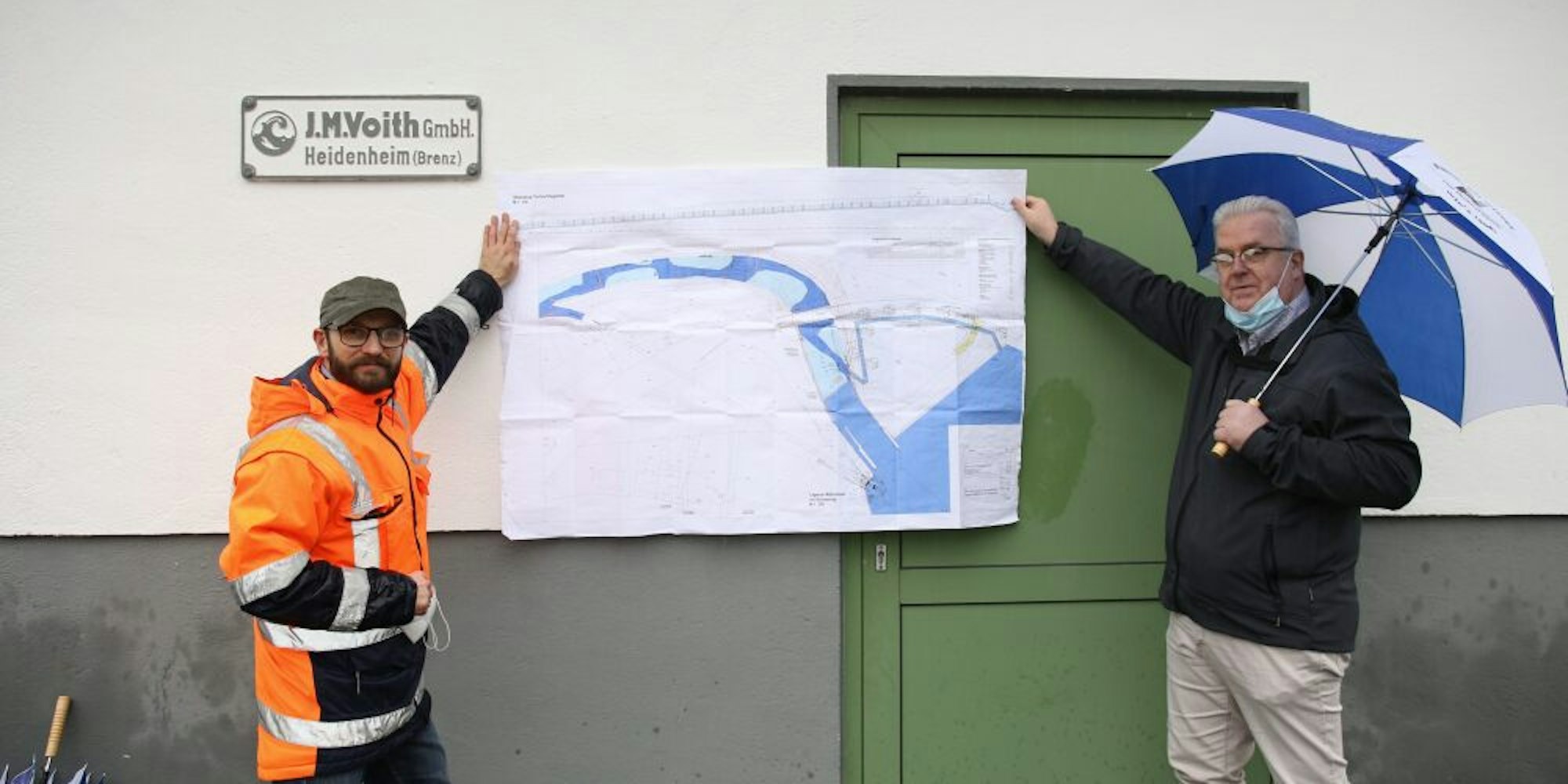 Wim Dissevelt (l.) und Axel Blüm vom Aggerverband mit dem Plan für die Arbeiten, die das Wehr für Fische durchgängig machen soll.