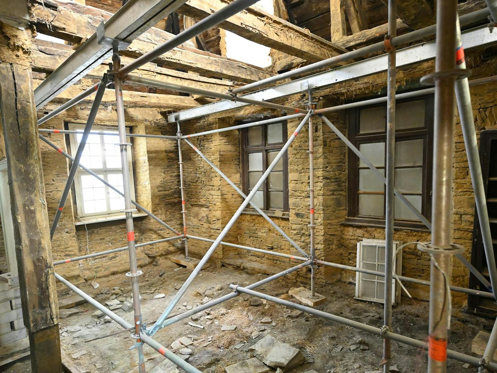Viel Arbeit gibt es derweil noch im Altbau. Überall blickt man auf die blanke Wände und die mit Stahlträgern abgestützten Holzbalken. „Wer sich mit der Komplettsanierung alter Gebäude befasst, weiß, dass es nur so gehen kann“, sagt Hefner.