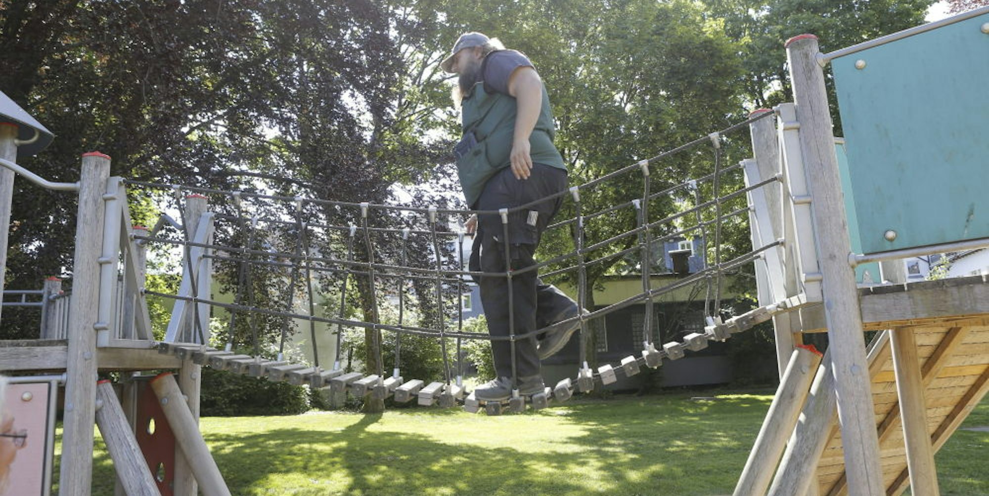 Wipperfürth – Martin rutscht die große Rutsche auf dem Spielplatz Ohler Wiesen runter und hat sichtlich Spaß dabei. Das wäre keiner Erwähnung wert, wenn Martin nicht von stattlicher Statur und 34 Jahre alt wäre. Er tut dies auch nicht zum Vergnügen, es ist sein Job. Martin Bayer ist zertifizierter Spielplatzprüfer und unterzieht die Anlage im Herzen von Wipperfürth der einmal im Jahr anfallenden Hauptinspektion. Quasi der TÜV für den Spielplatz. So schreibt es das Produktsicherheitsgesetz im Rahmen der Verkehrssicherungspflicht vor.
