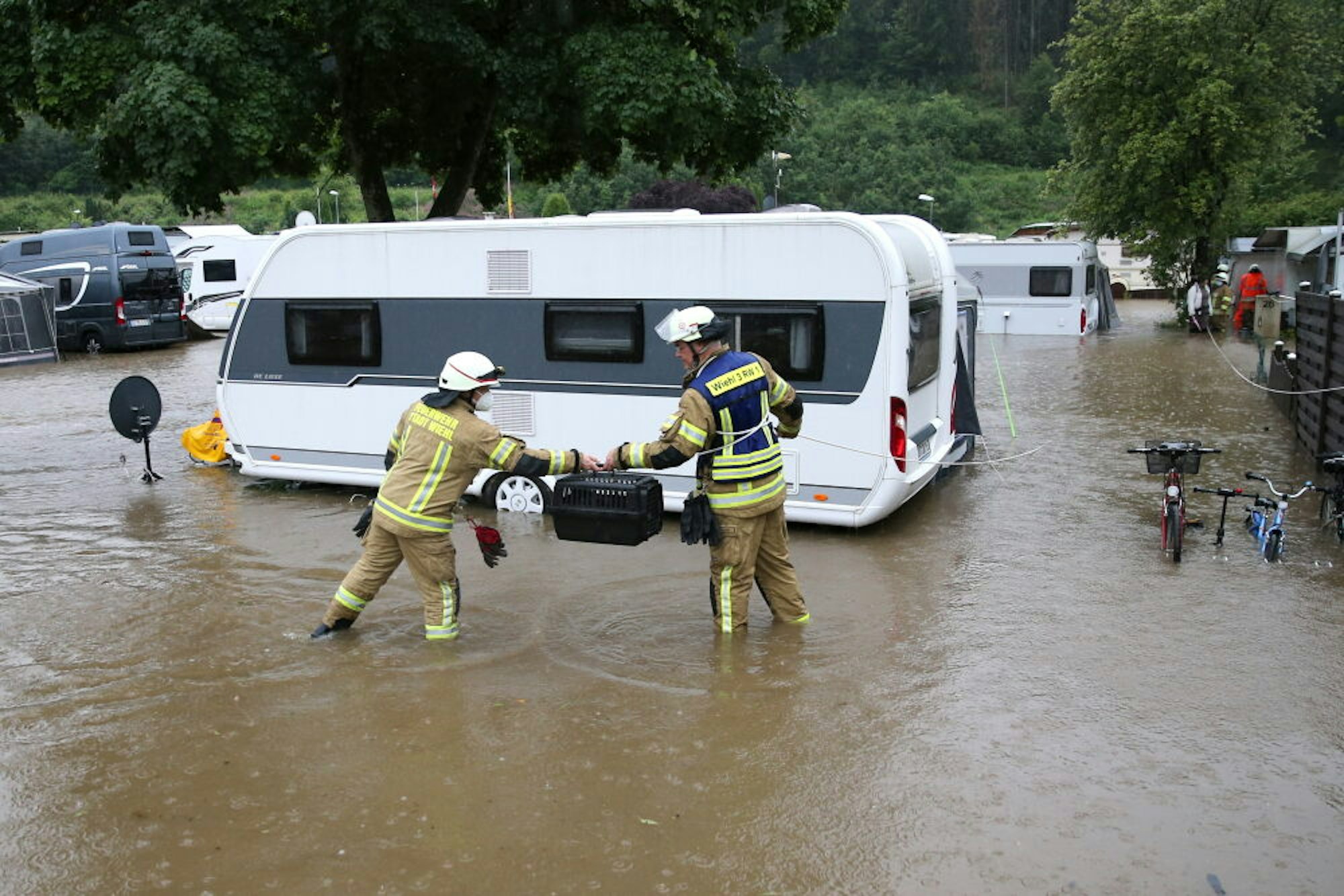 Überlaufende Talsperren, reißende Flüsse, fliehende Menschen und ein weggespültes Haus. Das Unwetter mit seinen verheerenden Fluten erreichte den Scheitelpunkt erst am Mittwoch gegen Mitternacht, als die Regenwolken so gut wie abgezogen waren. Nach einem Tag, an dem sich der Starkregen und die Einsatzlage minütlich zugespitzt hatten, warteten in der Dämmerung und Dunkelheit die größten Herausforderungen auf die Feuerwehrleute und anderen Einsatzkräfte. Im Kampf gegen die Wassermassen blieb manchen kaum eine Stunde Schlaf.