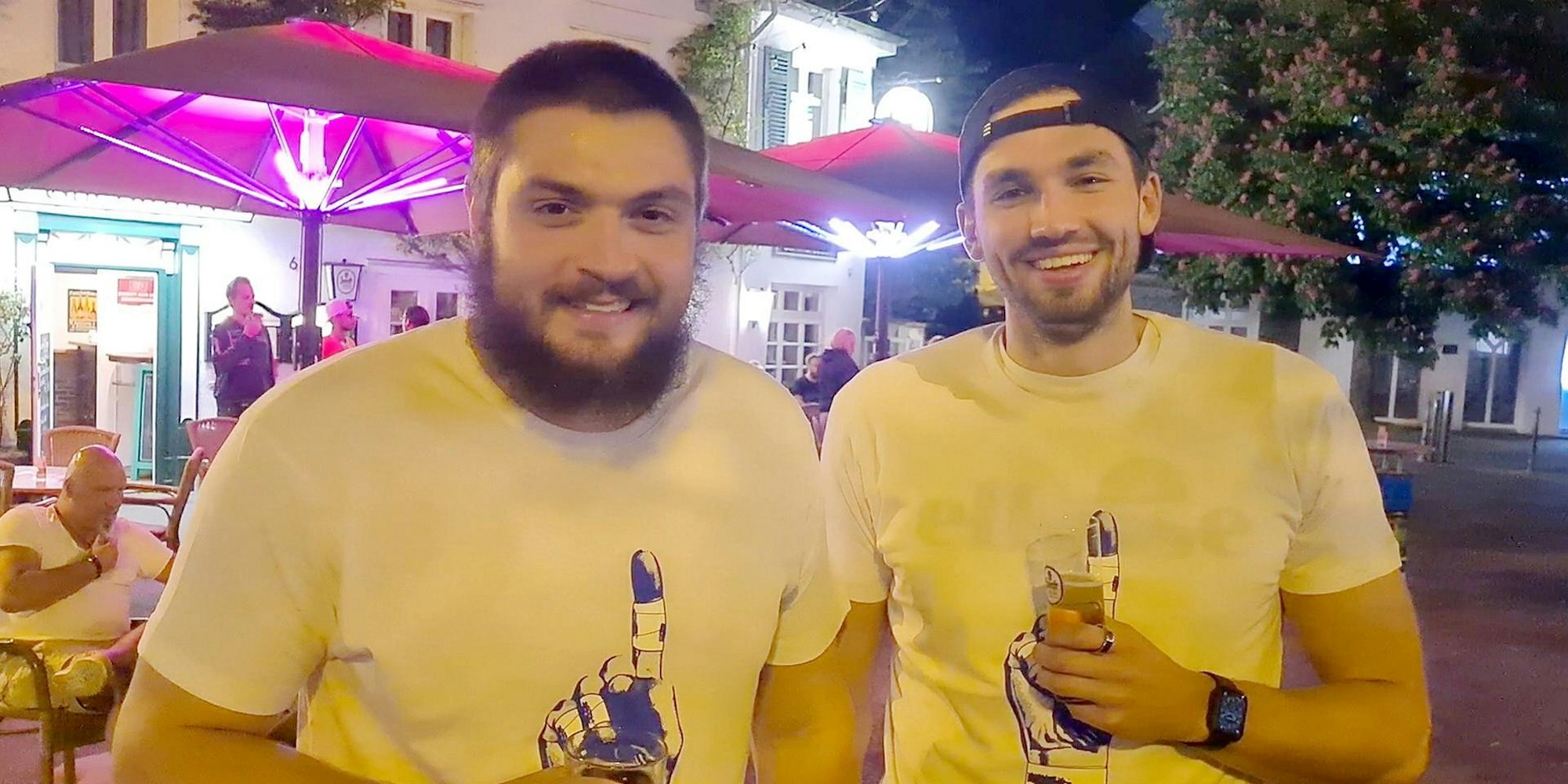 Einen Dank sandten Jonas Stüber (l.) und Fynn Herzig an den Ex-Mitspieler Pierre Busch.