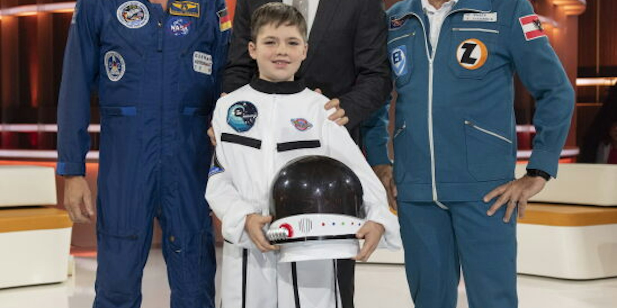 Josias (11) aus Gummersbach mit dem Moderator von „Klein gegen Groß“, Kai Pflaume, und den Astronauten Ulrich Walther (l.) und Franz Viehböck.