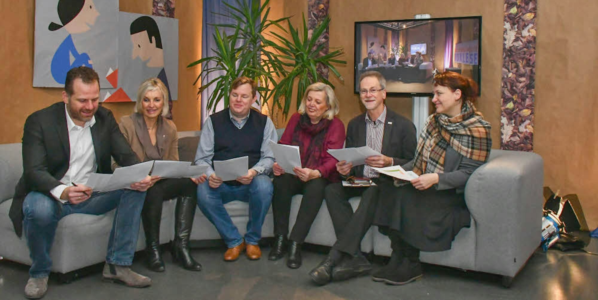 Auf dem Sofa im TV-Studio (v.r.): Lucy Scharenberg, Manfred Stern, Claudia Schulte-Terboven, Mike Altwicker, Anke Koester und OVZ-Redaktionsleiter Frank Klemmer wählten aus, von welchen Vorleseorten am Freitag live übertragen werden soll.