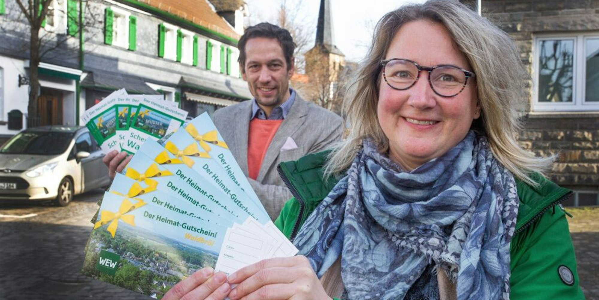 Mit Heimat-Gutscheinen wollen Sandra Becker und Sebastian Barth von der Waldbröler Werbegemeinschaft den Handel stärken.