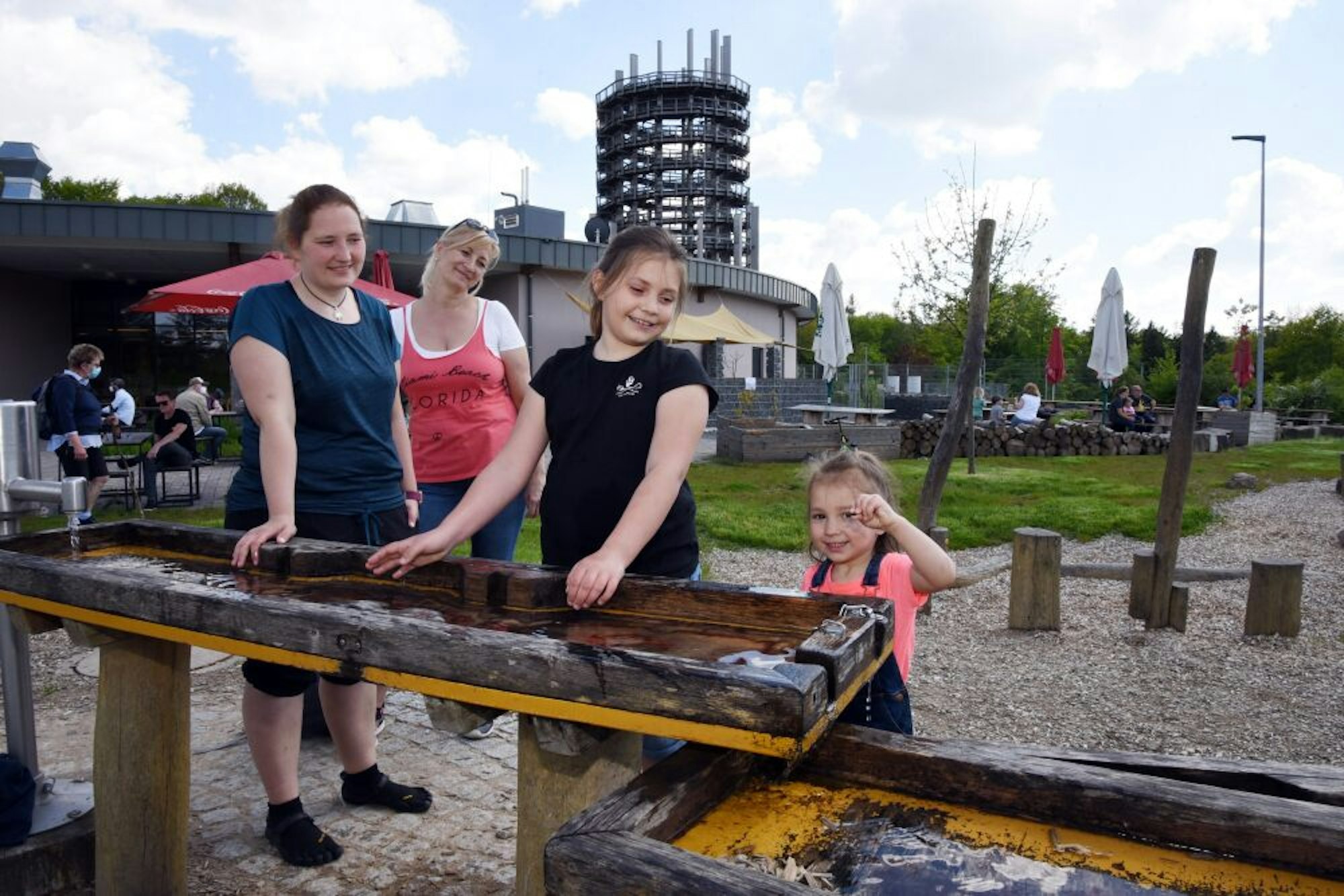 So lange haben es Janine Wunderlich und ihre Familie aus Neuwied nicht ausgehalten. Sie haben gleich zu Anfang die tolle Aussicht vom Turm genossen. Nun kühlen sich die beiden Töchter Bella und Ivy am Wasser ab, während es sich Janine Wunderlich und ihre Mutter Katrin Holzmüller, die derzeit bei ihrer Tochter und ihren Enkelinnen zu Besuch ist, in der Sonne gut gehen lassen. Auch für sie ist es die Premiere in Panarbora. „Wir sind überrascht, dass nicht mehr los ist“, meint Holzmüller – sie ist aber gleichzeitig froh, dass genügend Platz auf den Wiesen und Wegen ist.