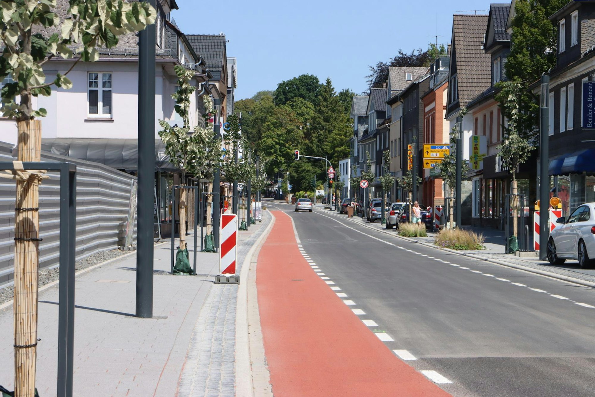 580 Asphaltmeter sind seit dem 4. Mai 2020 zwischen der Friedenstraße und dem Brölbahnkreisel auf Vordermann gebracht worden. Während der motorisierte Verkehr bald nur noch mit Tempo 30 – für eine Bundesstraße ist das eine Besonderheit – in eine Richtung fließen darf, steht die Kaiserstraße Fahrradfahrern dagegen in beide Richtungen offen. Die dem Autoverkehr entgegenkommende Spur ist tiefrot eingefärbt. (höh)