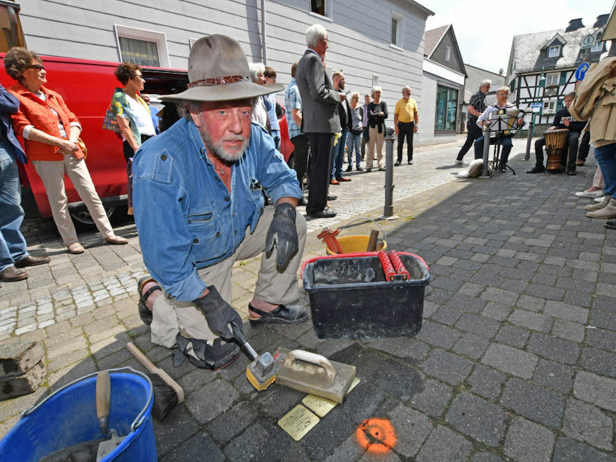 An der Querstraße im Waldbröler Stadtzentrum fügte der Künstler Gunter Demnig gestern die ersten „Stolpersteine“ in das Straßenpflaster. Diese erinnern an die jüdische Familie Elias.