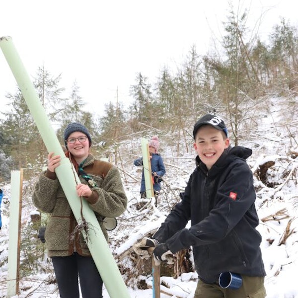 Dem Ensemble und dem Produzent liegen die Themen Nachhaltigkeit und Klimaschutz am Herzen. „Wir sind ein ,Green Musical'“, erklärte Vera Bolten. „Wir nutzen in der Spielstätte grünen Strom, arbeiten mit LED-Leuchten. In den Pausen gibt es Getränke aus der Region in Mehrwegflaschen“, ging Renate Schmitz ins Detail. Das Unternehmen „Forstfreunde“ pachtet Waldgebiete. „Wir stehen für Klimaschutz und den Erhalt der Natur. Zerstörte Flächen werden dauerhaft aufgeforstet – dafür suchen wir Baumspenden“, erklärte Geschäftsführer Patrick Köhler. Zusammen mit Robin Kracht war er zur Pflanzaktion gekommen – und hatte den Musicaldarstellern die passenden Setzlinge mitgebracht.