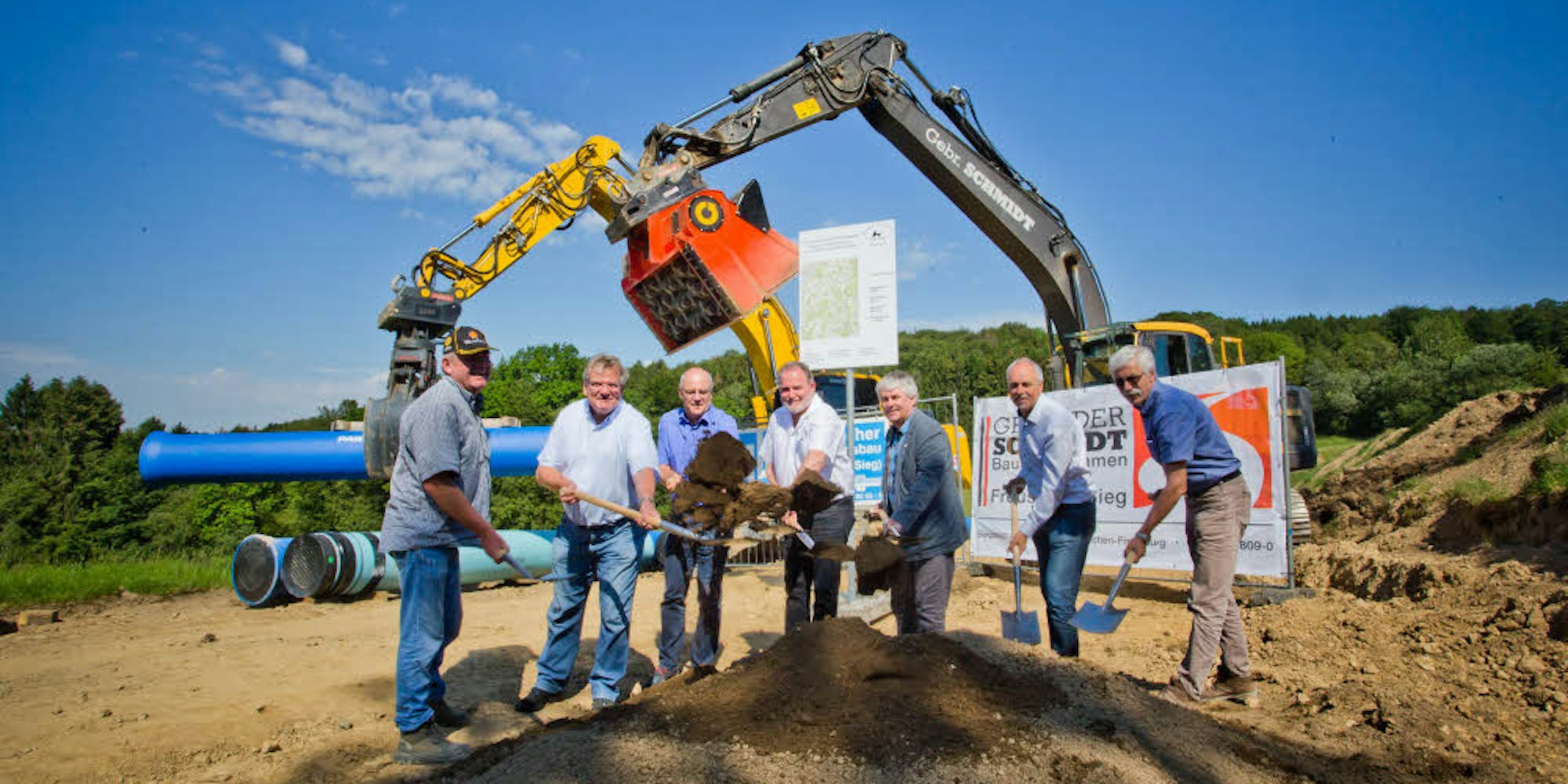 „Mit der Parallelverlegung erzielen wir den geringsten Eingriff in die Natur“, sagen Prof. Scheuer und seine Kollegen vom Aggerverband, die jetzt neben den Vertretern der beiden Baufirmen Schmidt (Freusburg) und Becher (Walberfeld) sowie Wissens Bürgermeister Michael Wagener in großer Zahl an einem offiziellen ersten Spatenstich für das Projekt unterhalb des CVJM-Heims Waldbröl-Lützingen teilnahmen.