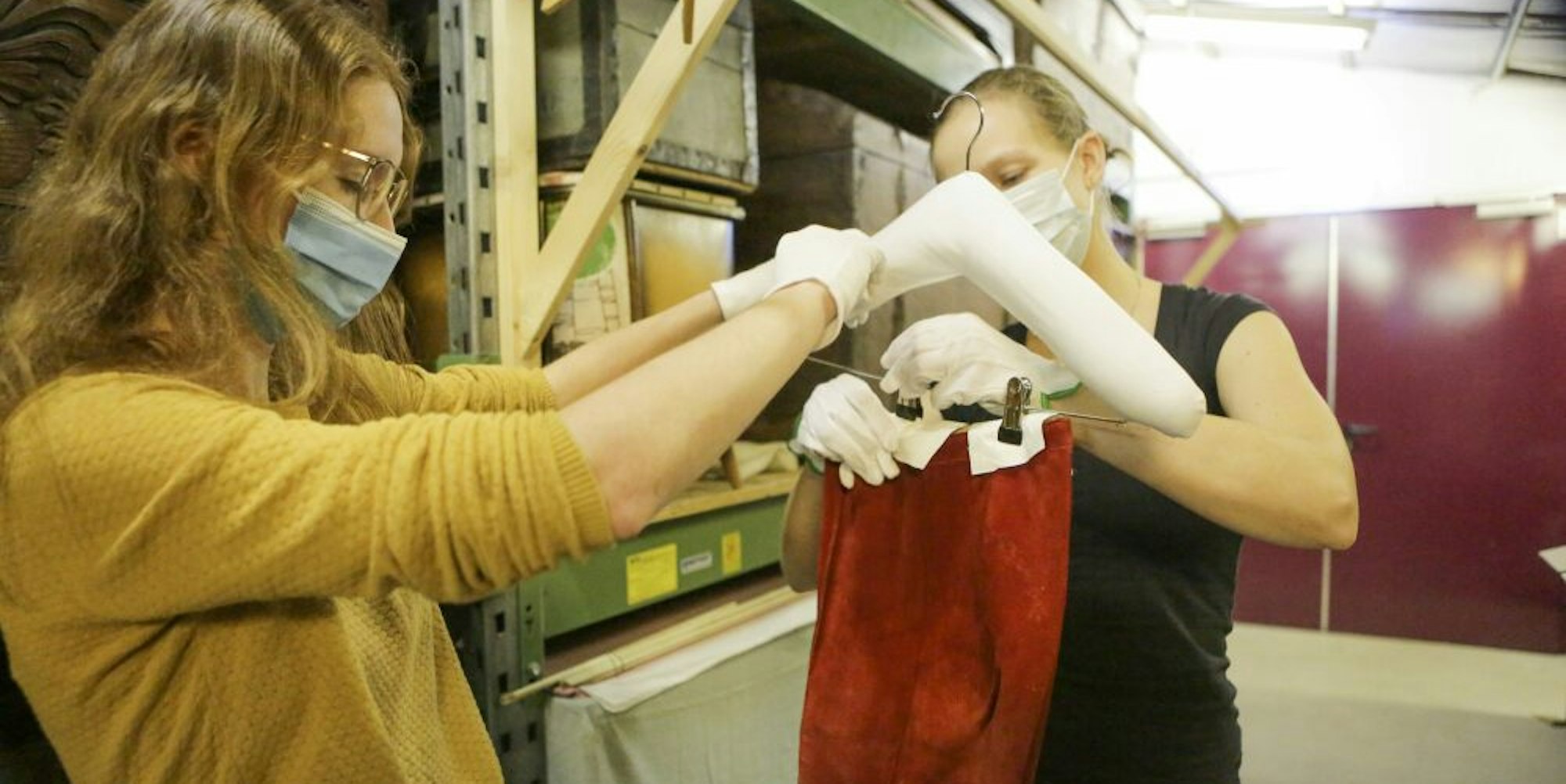 Zusammen mit Astrid Beling, die als Volontärin für die Restaurierung im Museum arbeitet, nimmt sie eine rote Wildleder-Kombination aus den 1970er Jahren in Augenschein. Die beiden jungen Frauen entscheiden, dass sie nicht ein einem Karton gelagert, sondern auf einen gepolsterten Bügel gehängt werden soll. Denn durch Falten könnten Druckstellen entstehen.