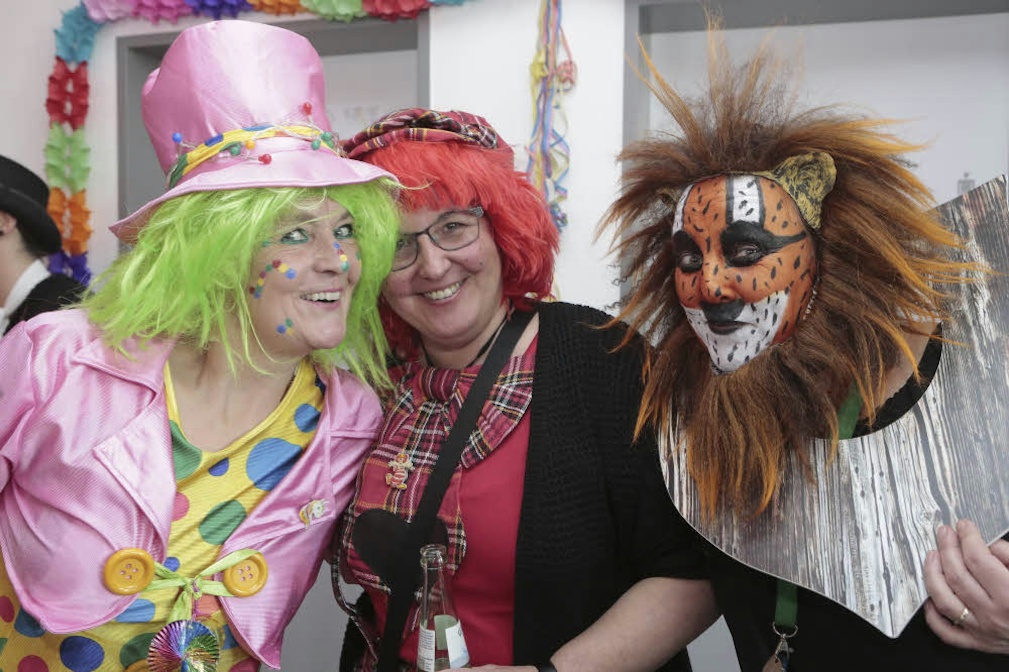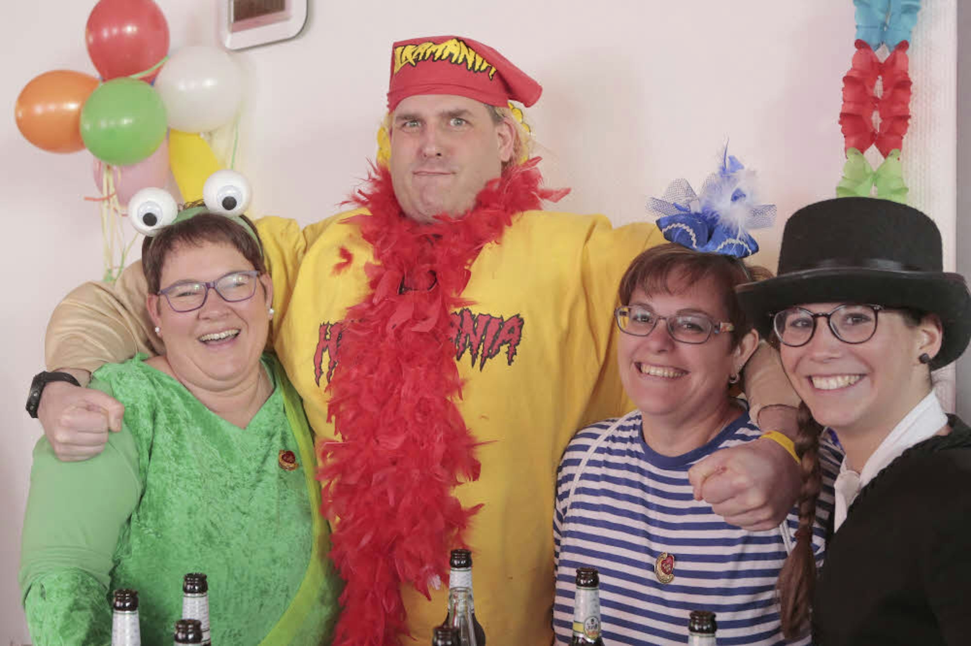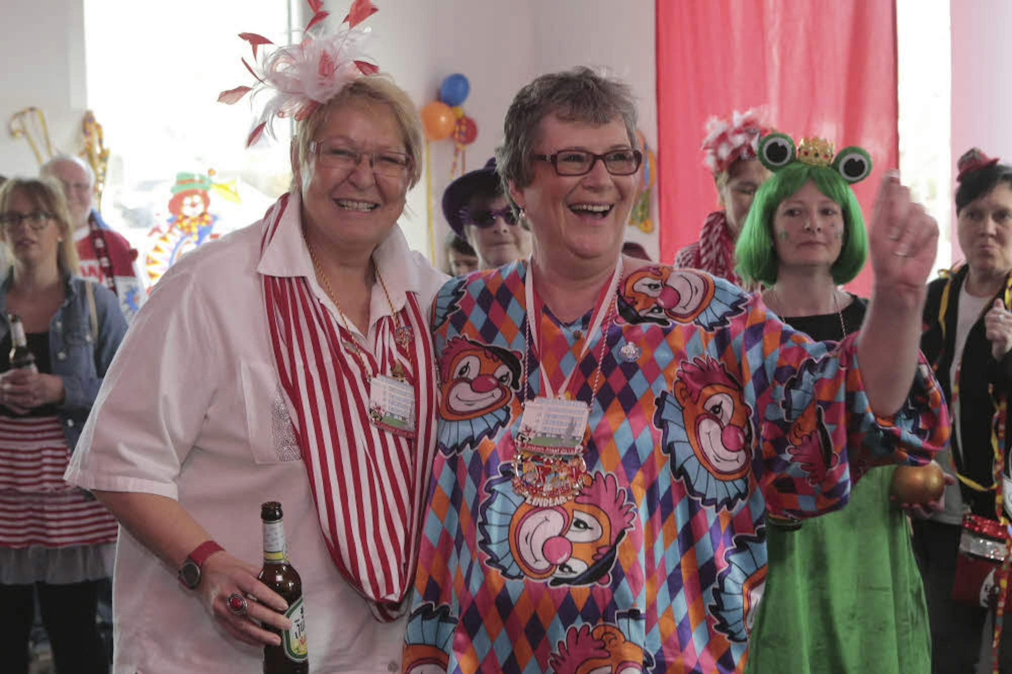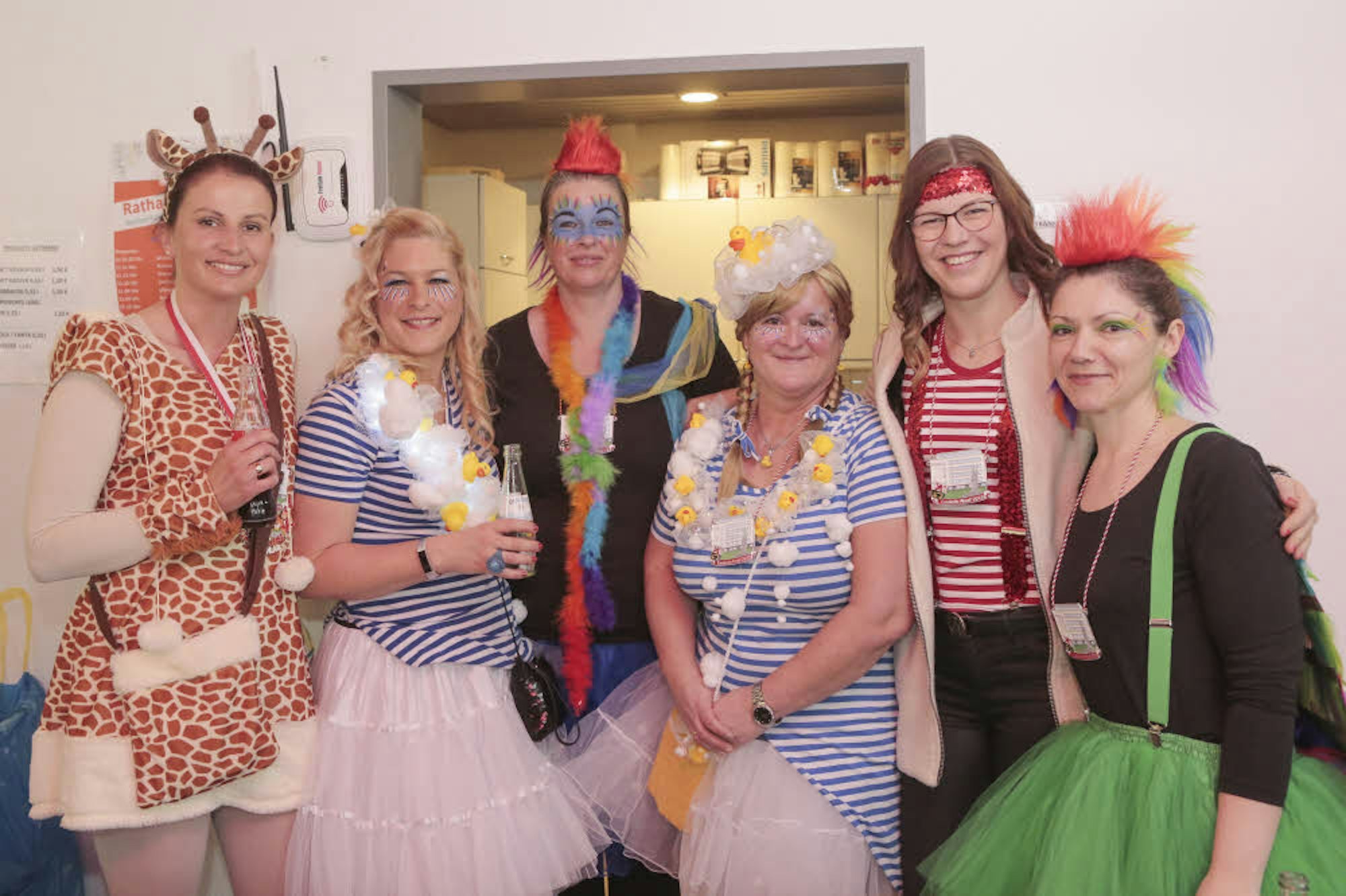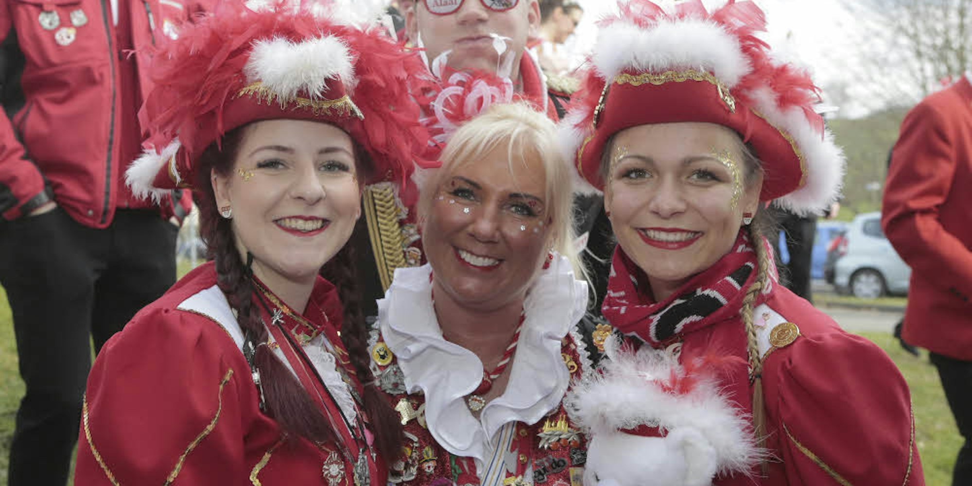Zeitgleich tut sich am alten Krankenhaus einiges. Busse der Karnevalsgesellschaft Rot-Weiß fahren vor, das Kinderprinzenpaar mit Mathilda und Jan Luca nebst Schmölzchen trifft ein. Auch die Gegenseite hat aufgerüstet. Ausgesprochen viele Lindlarer Frauen versammeln sich und schunkeln als Quietscheenten, Giraffen und Paradiesvögel gen Rathaus. Julia Wolf ist in einen Raketenanzug geschlüpft und sorgt für die Schubkraft der bunten Truppe. Die Speerspitze bilden Sandra König, Rosi Dlusniewski, Sandra Pajak und Bianca Bahtiri.