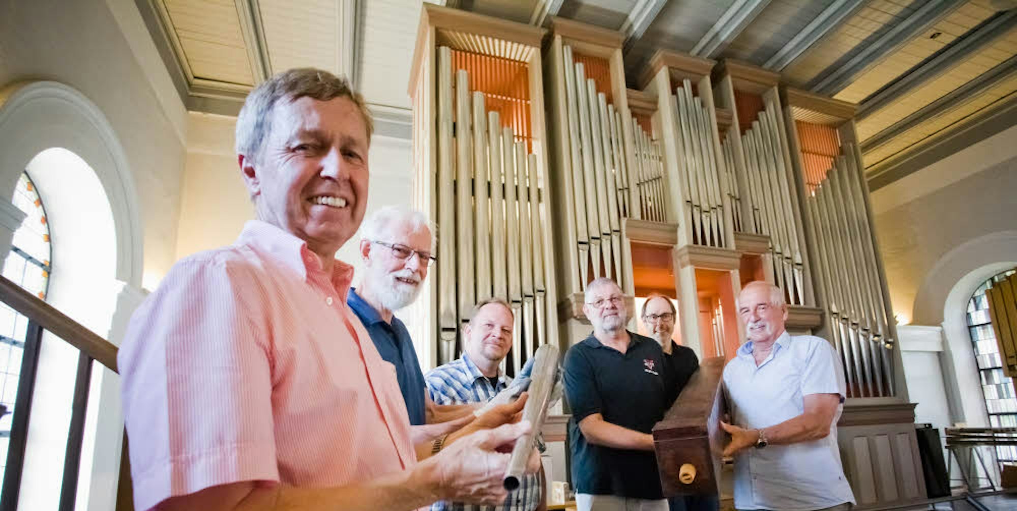 Pfeifenreiniger: Orgelbauer Stephan Oppel (3.v.l.) mit Kantor Michael Müller-Ebbinghaus (2.v.r.) und Vertretern des Presbyteriums.