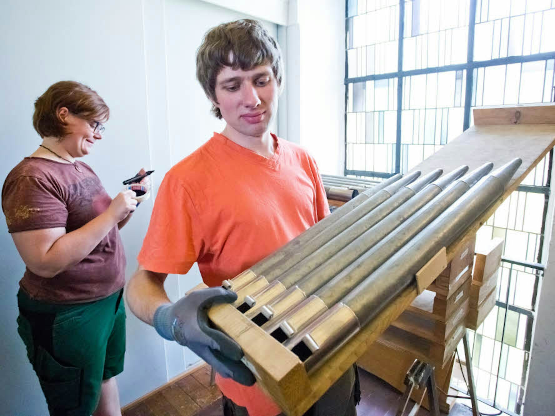 Sechs von 1730: Die Mitarbeiter der Firma Oppel haben damit begonnen, die Orgelpfeifen auszubauen und einzupacken.
