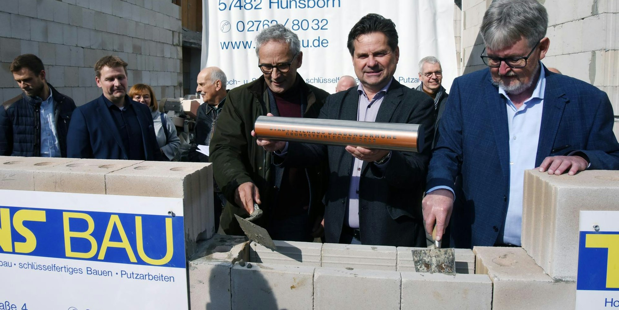 Andreas Zurek, Bürgermeister Ulrich Stücker und Bauausschussvorsitzender Werner Nohl mauerten die Kapsel ein.