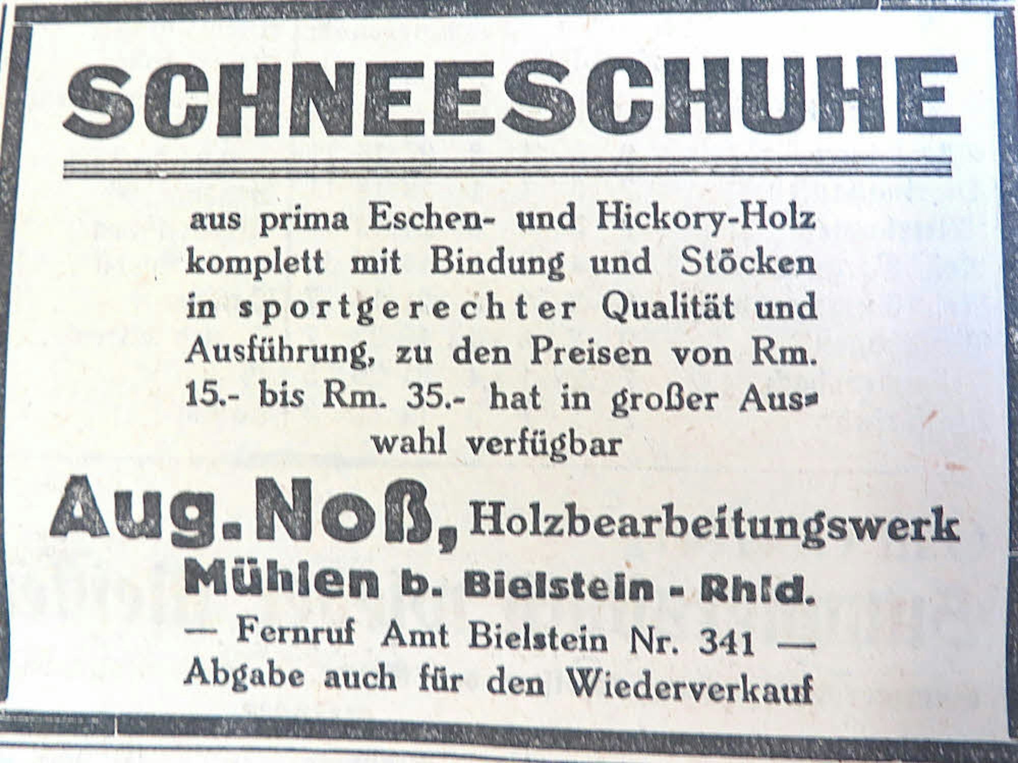 In einer Anzeige warb Noss bereits 1931 für „Schneeschuhe“, so hießen damals Skier. Selbst produzierten die Mühlener aber erst ab den 50er Jahren die Bretter.