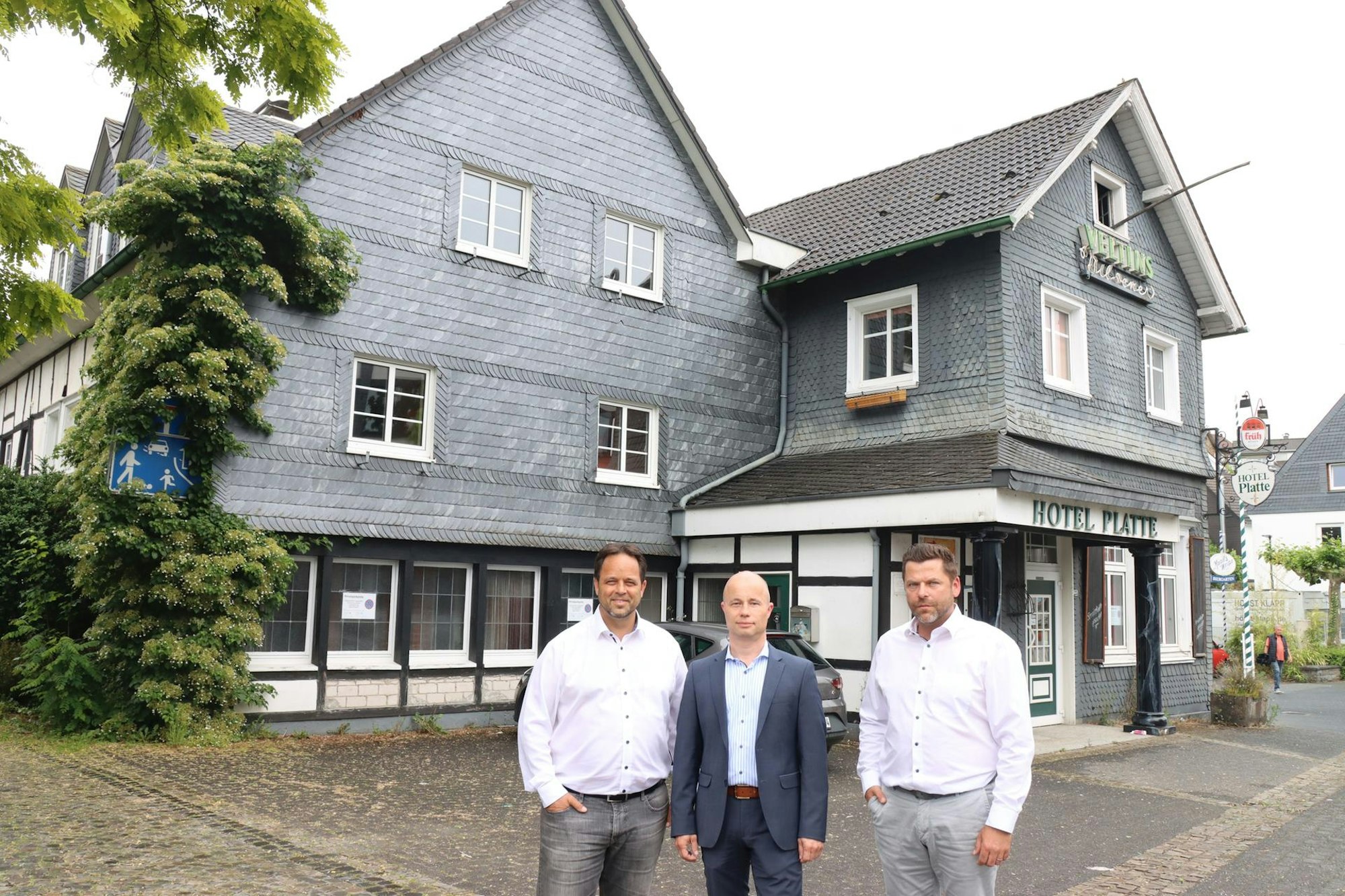 Die Investoren (o., v.l.) Jens Kleemann, Dirk Schmittseifer und Nico Burgmer sind verärgert über den Umgang mit ihrem Plan für einen Neubau auf dem Gelände des Hotels Platte.