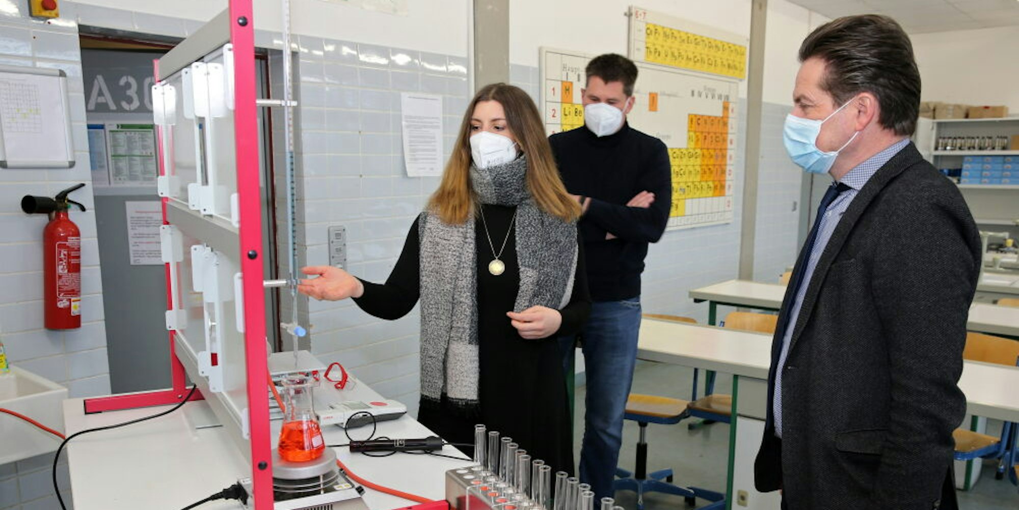 Bei der Besichtigung erläuterte Chemielehrerin Katrin Schmitz Bürgermeister Ulrich Stücker (r.) und Schulleiter Frank Mistler einen Versuchsaufbau.
