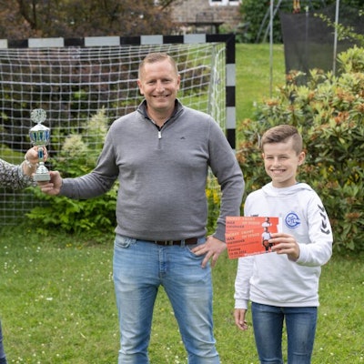 Auf dem Sportplatz in Marienhagen überreichte Andrea Knitter den Pokal und den VfL-Gutschein an Michel Hock.