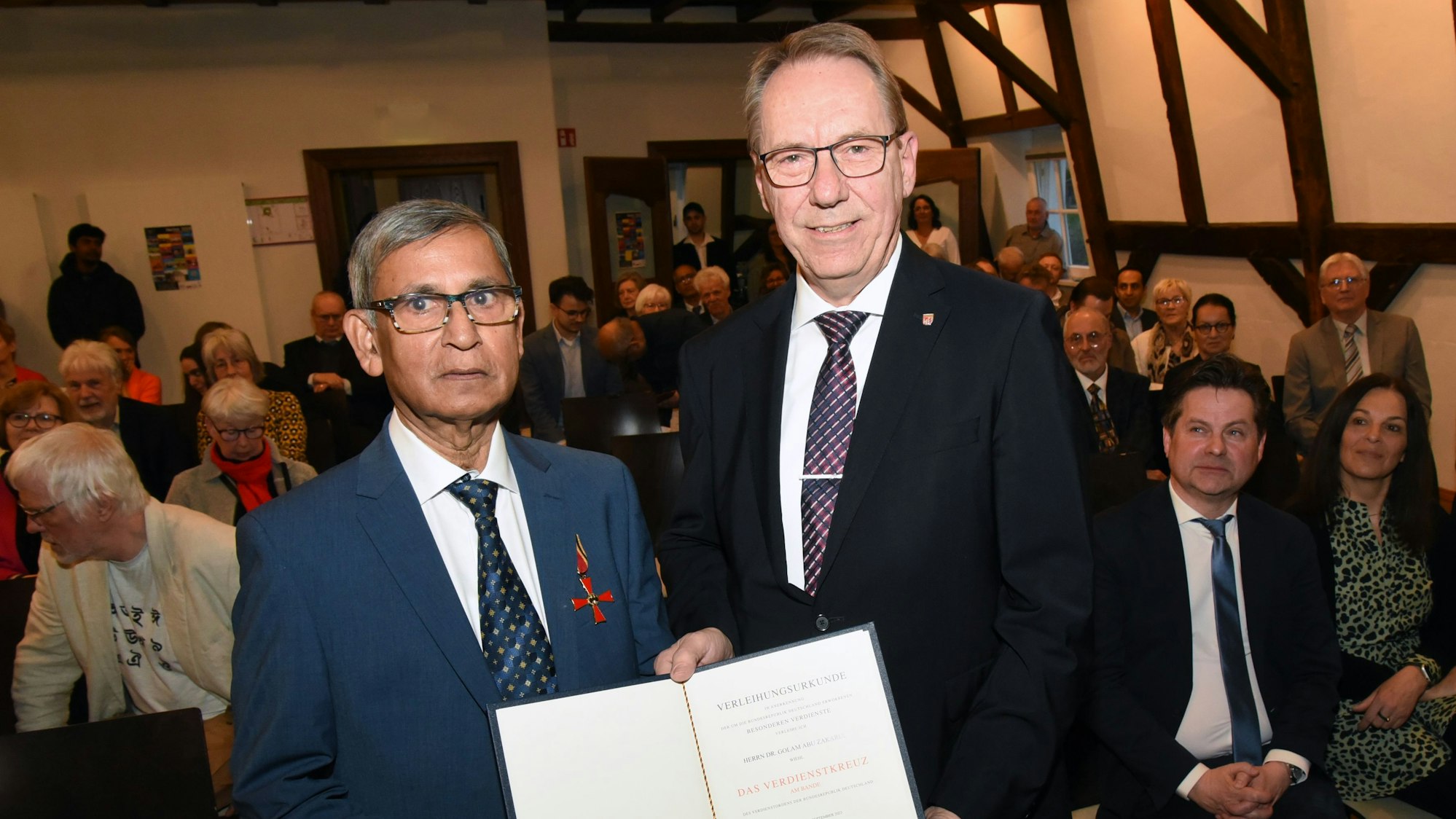 Im Namen des Bundespräsidenten zeichnete Landrat Jochen Hagt den Wiehler Physiker Golam Abu Zakaria mit dem Verdienstorden aus.