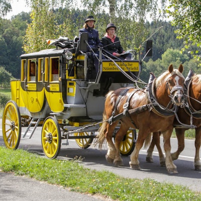 So ganz historisch war die Postkutsche dann allerdings nicht. Sie war ein Nachbau einer kaiserlichen Postkutsche, wie sie 1871 über die Straßen rumpelten, hatte neun Sitze und entstand in Ründeroth bei der Firma Wagenbau Müller. Die preußische Uniform ließ Postillon Friedhelm Stöcker sich in Dortmund anfertigen. Stöcker war von Anfang an in das Projekt eingebunden gewesen. 1973 war er Gastwirt des Sonnenhofs in Nümbrecht und begeistert von der Idee, den Tourismus auf ungewöhnliche Art anzuschieben.