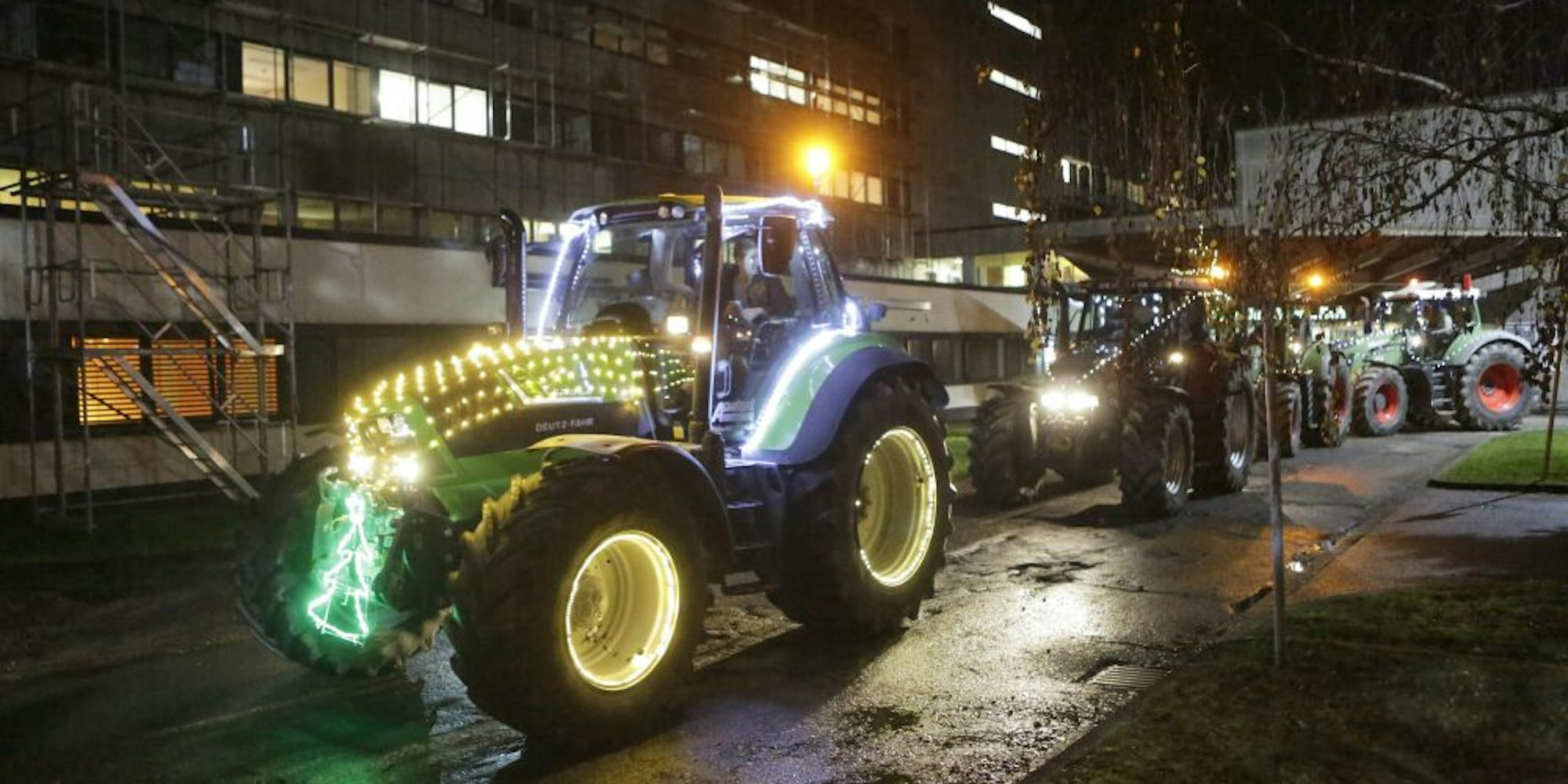 Zahlreiche Passanten verfolgten, wie die schweren Maschinen an der Alten-Kölner-Straße eine Ehrenrunde drehten. Patienten winkten aus den Fenstern, das Team der Notaufnahme legte eine Pause ein und trat ins Freie. Die Kolonne hatte sich zuvor gut hörbar angekündigt. Patrick Schwamborn steuerte den ersten Traktor der Reihe und hatte den Heckcontainer mit einer gigantischen Musikanlage beladen, die Weihnachtsklassiker verbreitete. Auffälligster Traktor im bunten Feld war ein Claas-Modell mit 480-Pferdestärken und meterhohem Nikolaus am Heck.