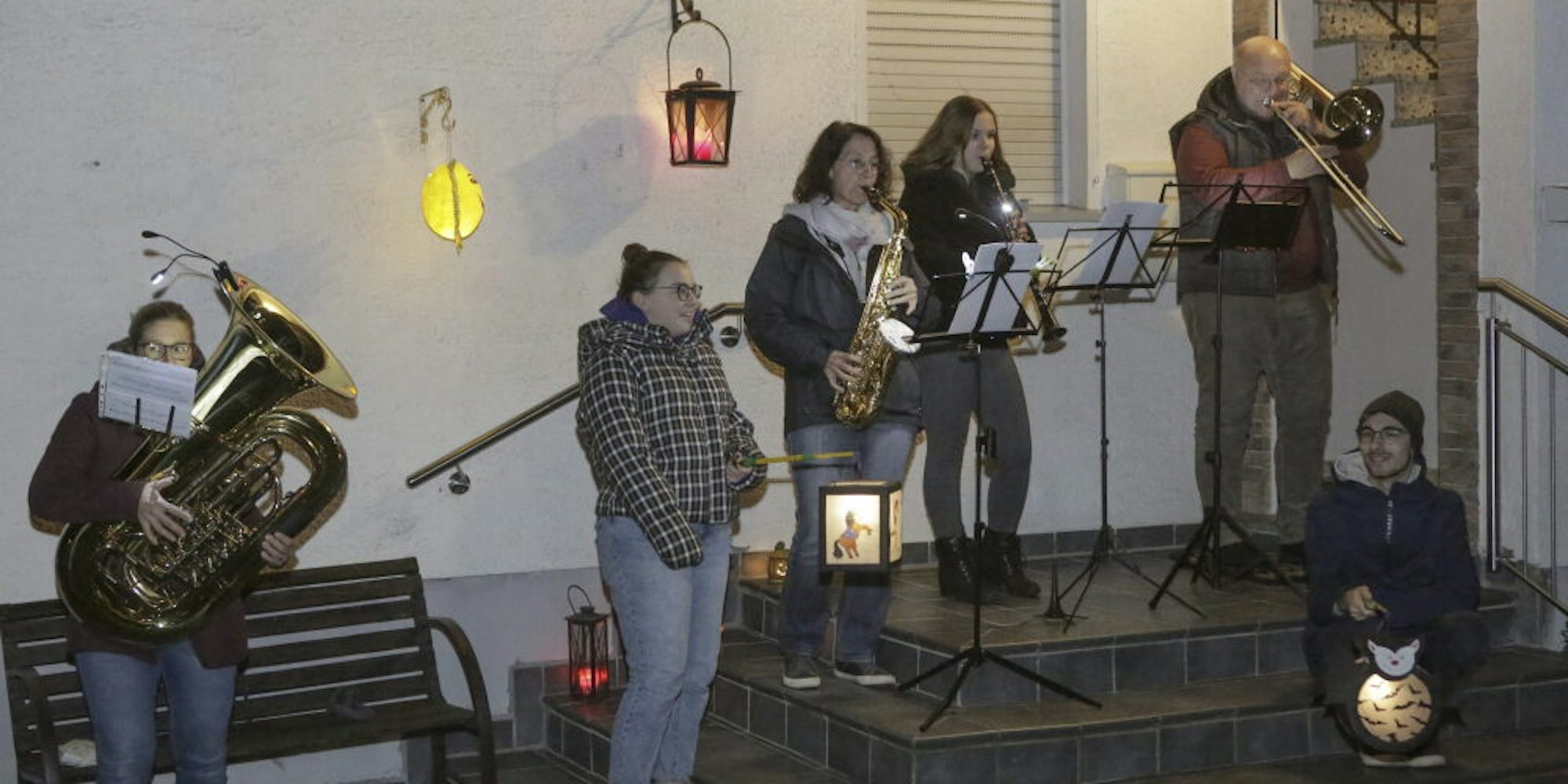 von Christoph Klein (2.v.r.) spielt Martinslieder vor dem Haus.