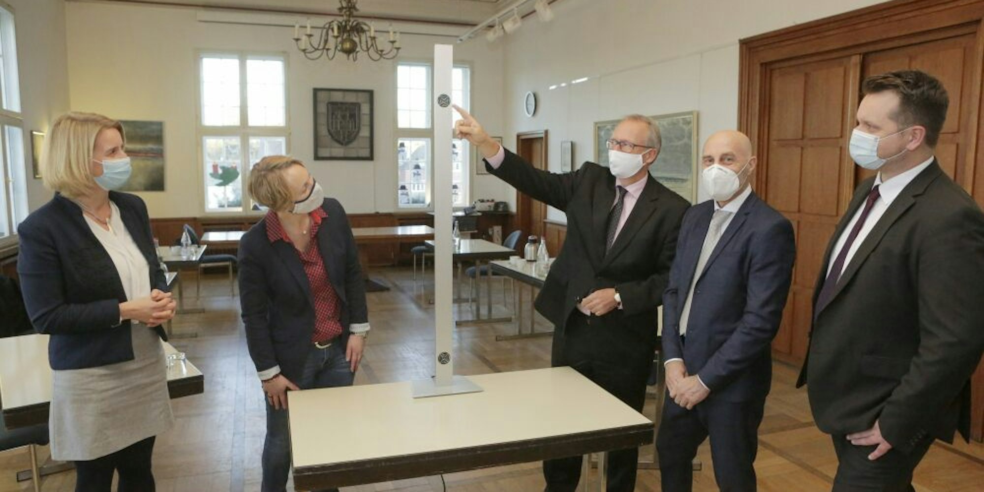 Da Radium schon seit mehr als 15 Jahren Erfahrung mit UVC-Lampen habe, sei die Entwicklung eines Gerätes zur Luftentkeimung und gegen das Corona-Virus ein folgerichtiger Schritt gewesen, so Krieger, der das erste der produzierten Geräte gemeinsam mit Geschäftsführer Markus Gosse und Vertriebsleiter Christian Berger an Wipperfürths Bürgermeisterin Anne Loth überreichte. Die bedankte sich herzlich und erkundigte sich ausführlich über Gerät und Unternehmen und legte fest, dass die Entkeimungs-Stele im Bürgerservice aufgestellt werde. Sie freue sich, dass ein solches Gerät, das einen Beitrag zur Bekämpfung der Corona-Pandemie beitragen könne, in der Hansestadt produziert werde.