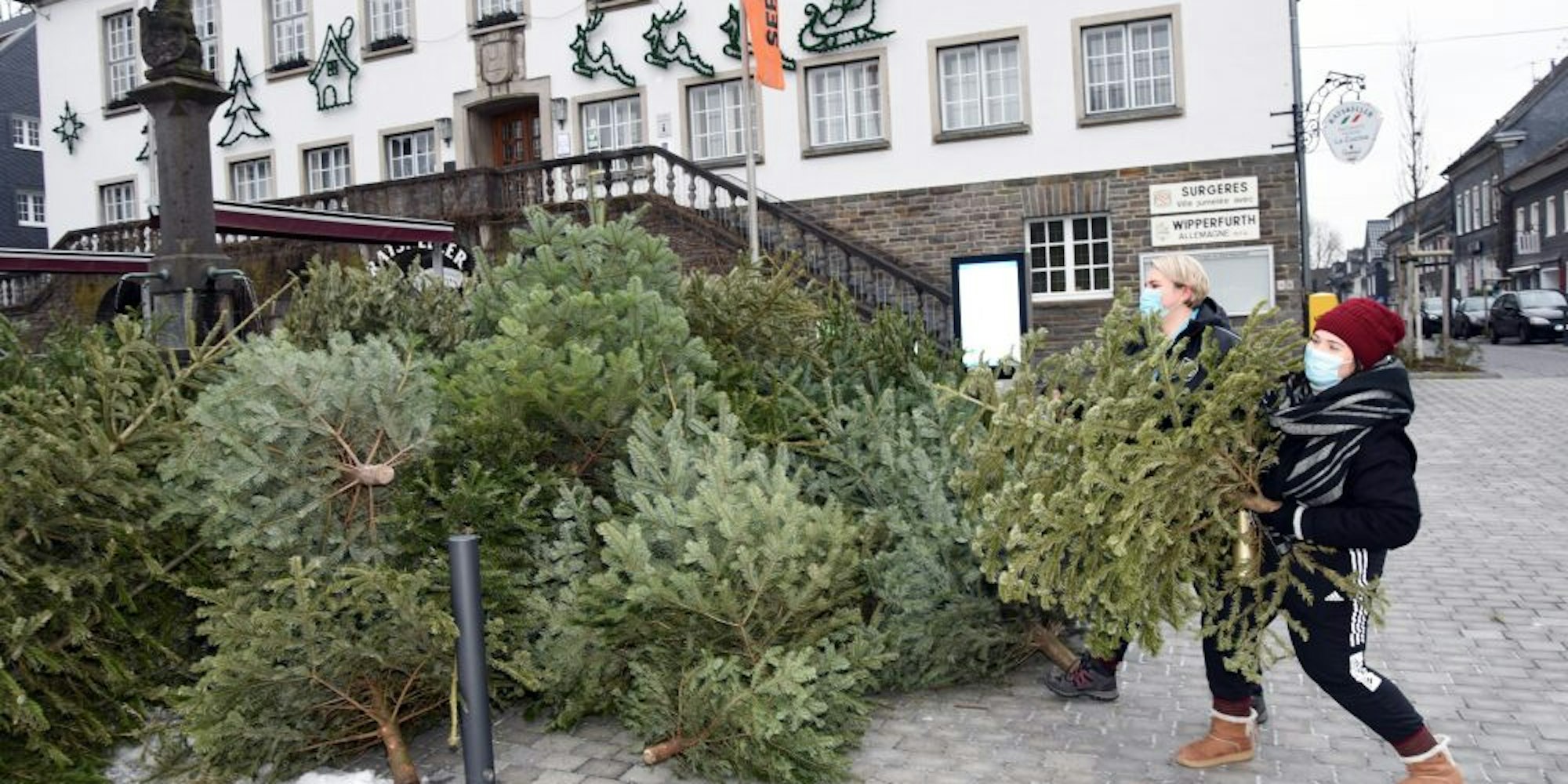 „Es ist halt Corona“, meint Andreas Müller von der DJK. Er bringt die gesammelten Bäume zum Wipperfelder Wanderparkplatz. Dort werden sie geschreddert.Das Geld das eingenommen wird, ist für die Jugendarbeit des Vereins. „So können wir unsere Freizeitangebote finanzieren“, sagt Marina Schultes und deutet auf die Spendendose. Tatsächlich wächst der Tannenstapel auf dem Marktplatz schnell. Schon bevor die Ehrenamtlichen ankamen lagen einige Bäume vor dem Rathaus. Das sei schade. so Fabienne Küster, denn die Sammelstation sei nur zu einer bestimmten Zeit besetzt. Auch wenn Bäume später abgelegt würde, könne sich die KJG nicht mehr darum kümmern.