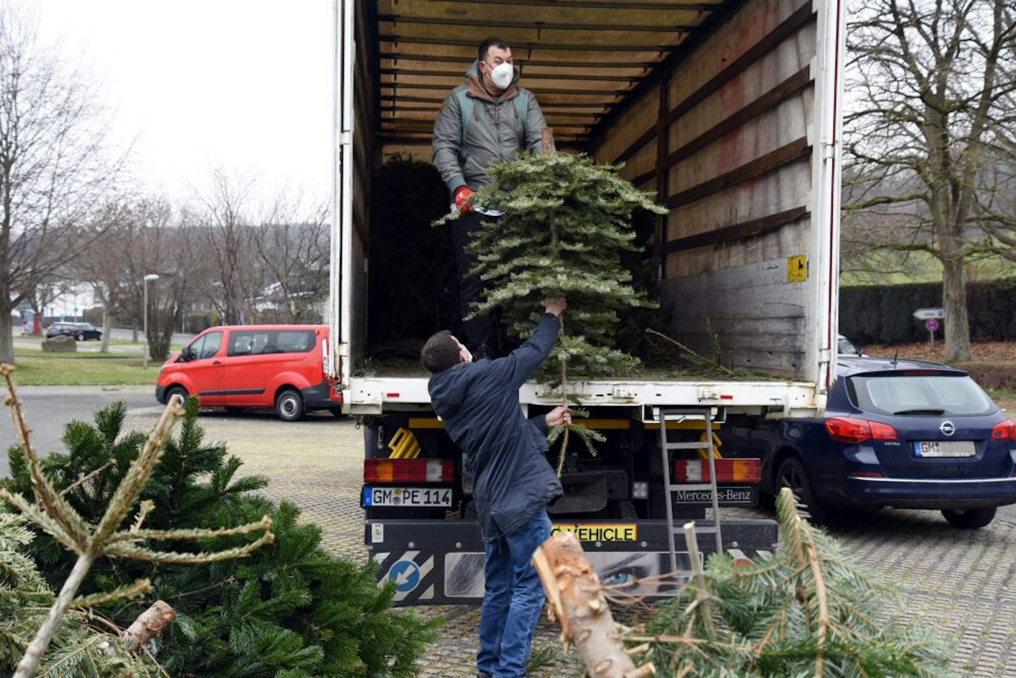Mit einem Lkw transportiert das DRK die ausrangierten Bäume vom Parkplatz am Lindlarer Rathaus zur Leppe-Deponie.