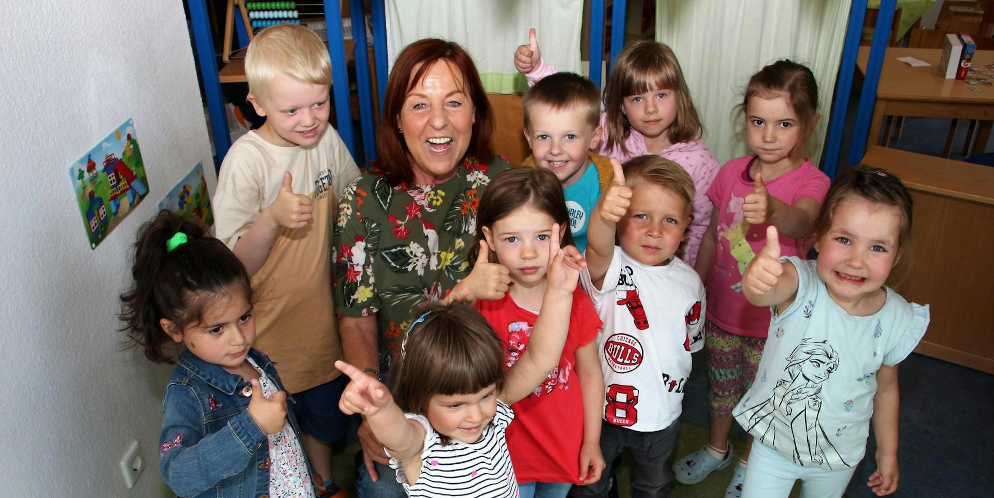 Martina Kloeber inmitten einer Kinderschar. 25 Jahre hat sie die Kita Sonnenkäfer geleitet.