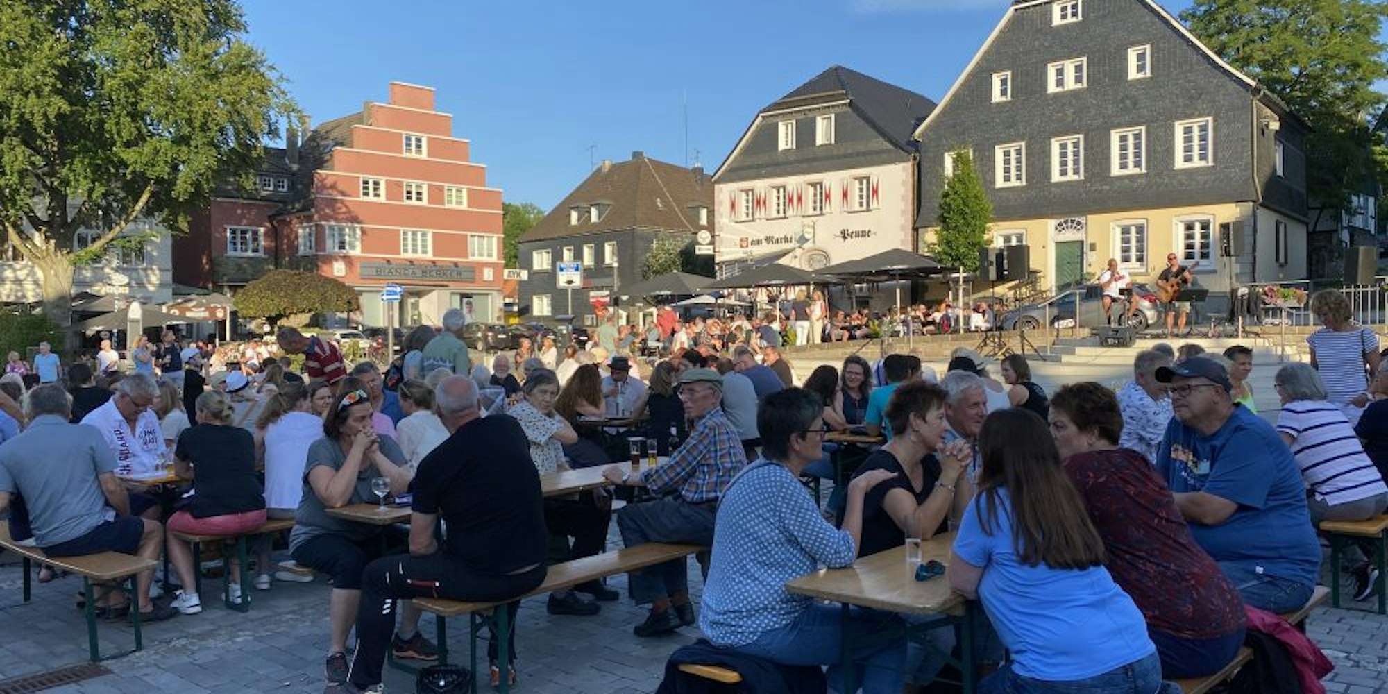 Wie in Scheinwerferlicht gehüllt, spielten die Musiker der Coverband ihre Songs unter den letzten Sonnenstrahlen des Tages, die sich nur auf sie richteten. Es waren bekannte Lieder, akustisch aufbereitet, vieles zum Mitsingen. Ein bisschen Pub-Atmosphäre versprühte das Bergische Akustik-Duo, bestehend aus Sänger Marc Dently und Gitarrist Jürgen Schwarzer, die auf der Treppe des Marktplatzes spielten. Üblicherweise besteht die Band aus drei Mitgliedern, am Samstag bestritten die Musiker den Abend ohne Andreas Marebach am Cajon, der sich im Familienurlaub befand – und das gönnten ihm seine Kollegen von Herzen.
