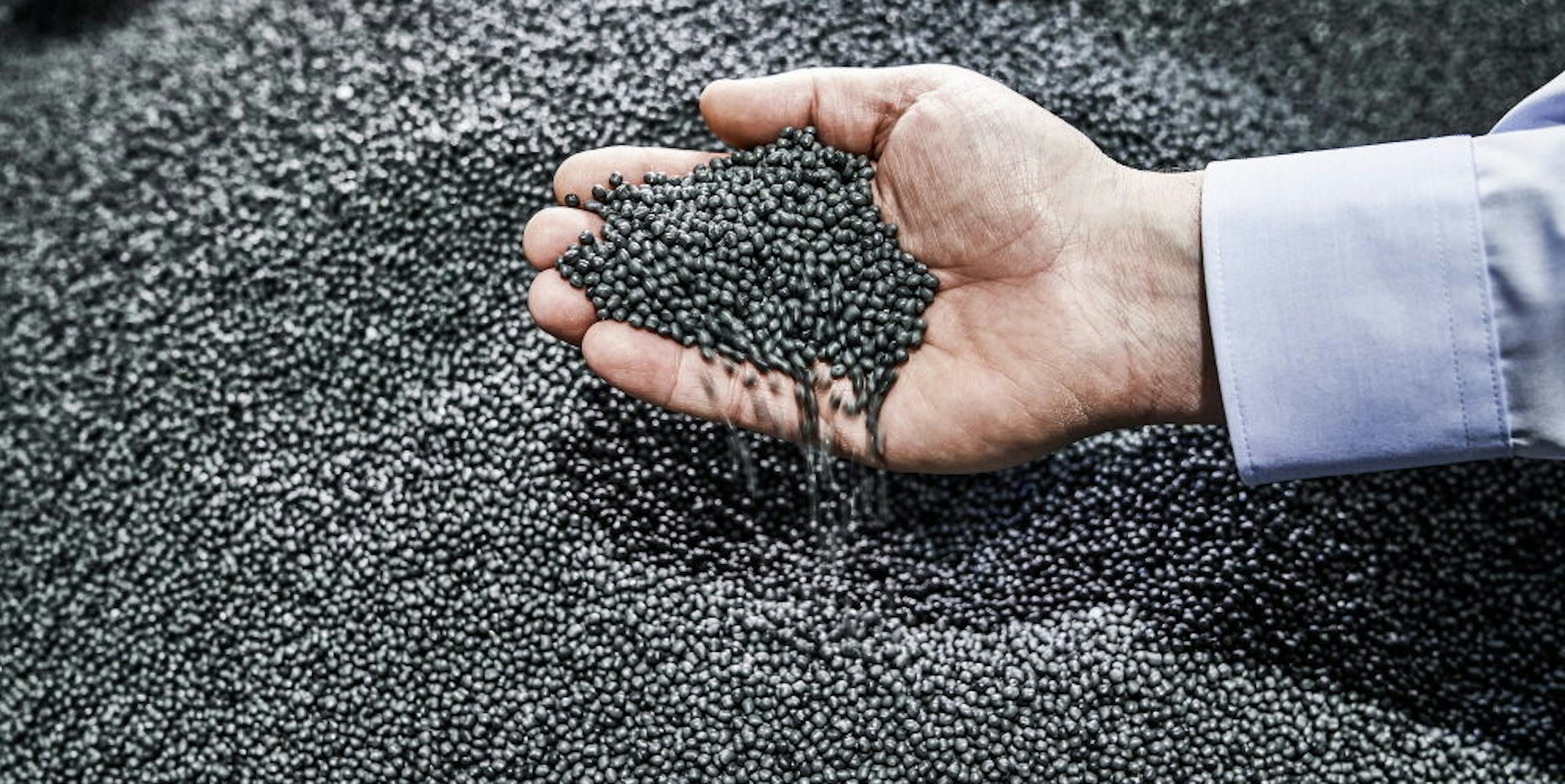 Das dunkle Granulat ist recycelter Kunststoff, der bei Jokey für die Produktion neuer Eimer genutzt wird.