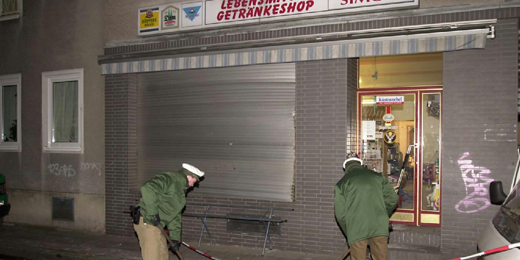 Das Lebensmittelgeschäft in der Kölner Probsteigasse nach dem Anschlag am 19.01.2001.