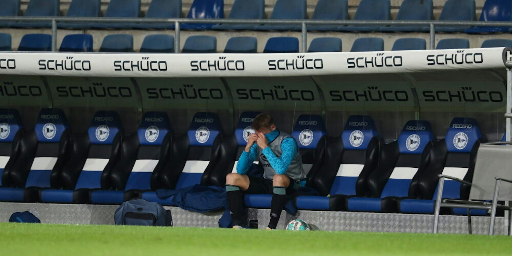 Das Aus am 30. Spieltag gegen Arminia Bielefeld: Schalkes Abwehrspieler Timo Becker sitzt nach dem Schlusspfiff allein auf der Bank.
