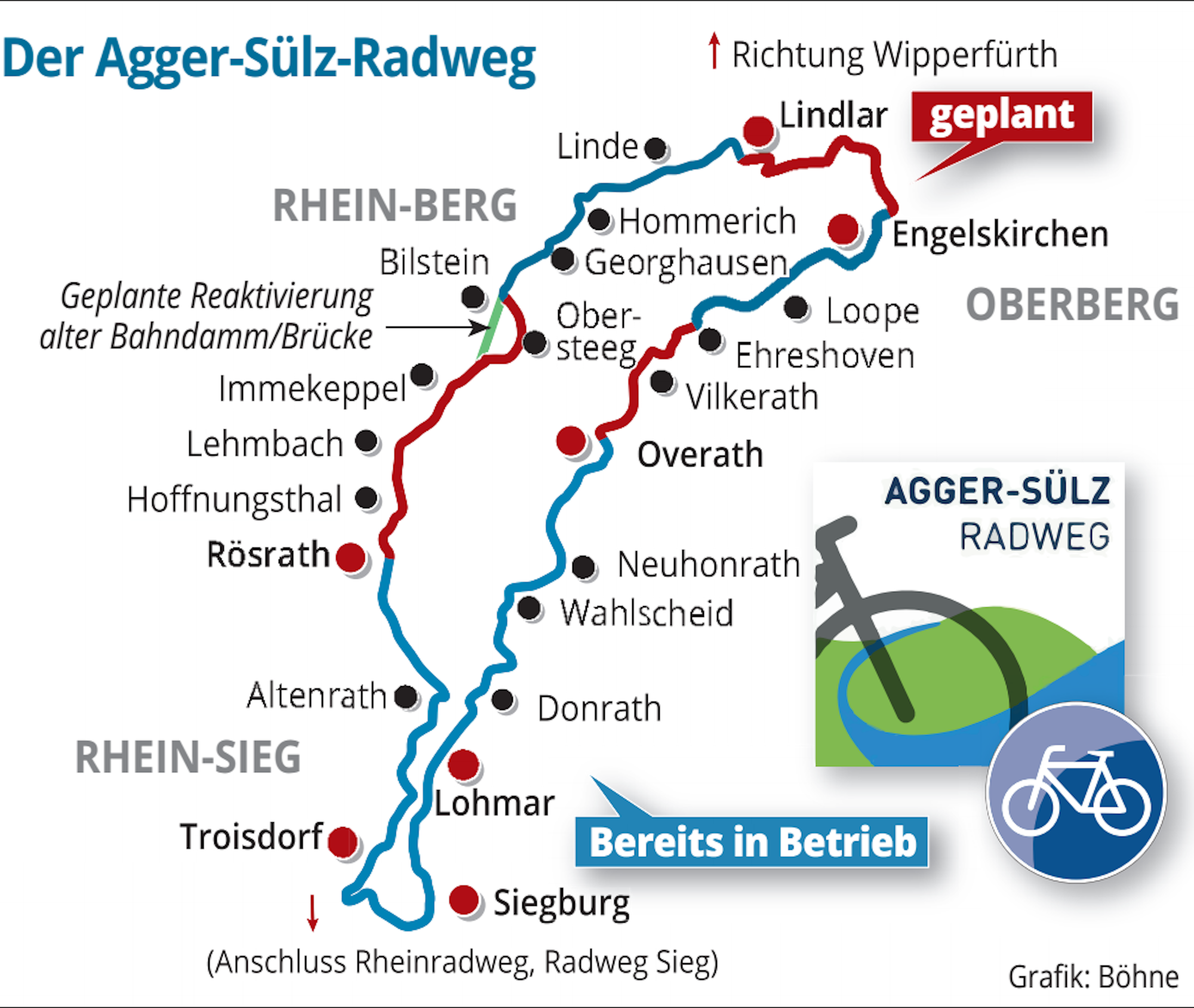 Im Zuge des rund 115 Kilometer langen Agger-Sülz-Radwegs soll damit eine weitere wichtige Lücke geschlossen werden. Vermessungsarbeiten seien bereits erfolgt, erste Lage- und Höhenpläne lägen vor, berichtete Projektleiterin Judith Heyer von der Kreisverwaltung im Zukunftsausschuss des Kreises.