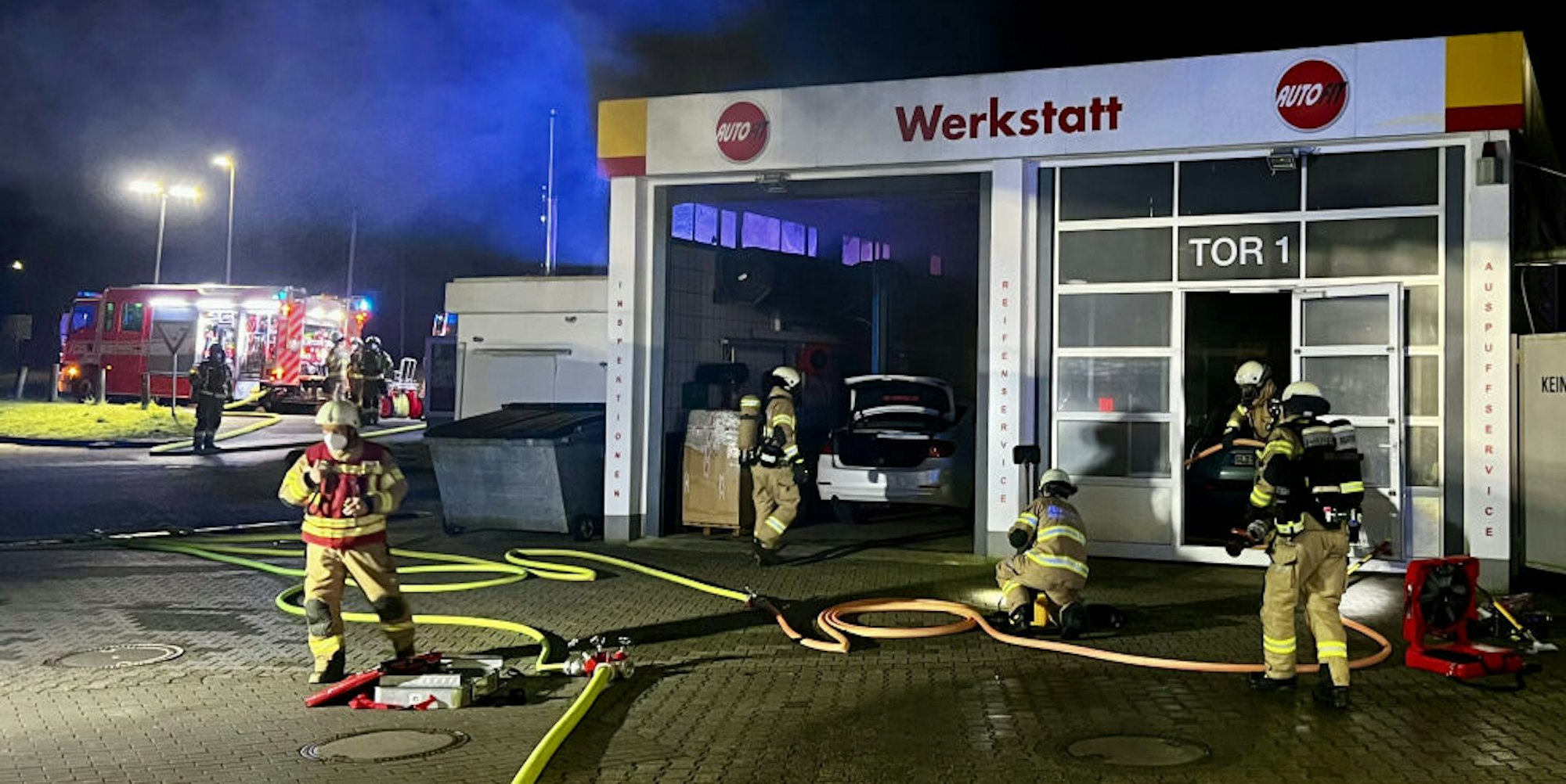 Als die ersten Feuerwehrleute am Einsatzort eintrafen, sahen sie, das Rauch aus einem Kfz-Werkstattgebäude auf dem Tankstellengebäude drang. Ein Glück: „Eine direkte Gefahr für die Tankstelle bestand nicht“, so Feuerwehrsprecher Schneiders.