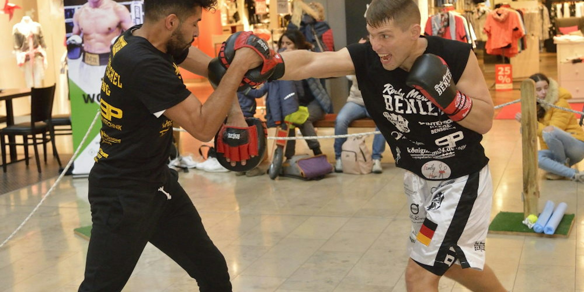 Mit einem Sparring in der Rhein Berg-Galerie bereitete sich Sergej Wotschel (r.) auf seinen ersten EM-Kampf vor.