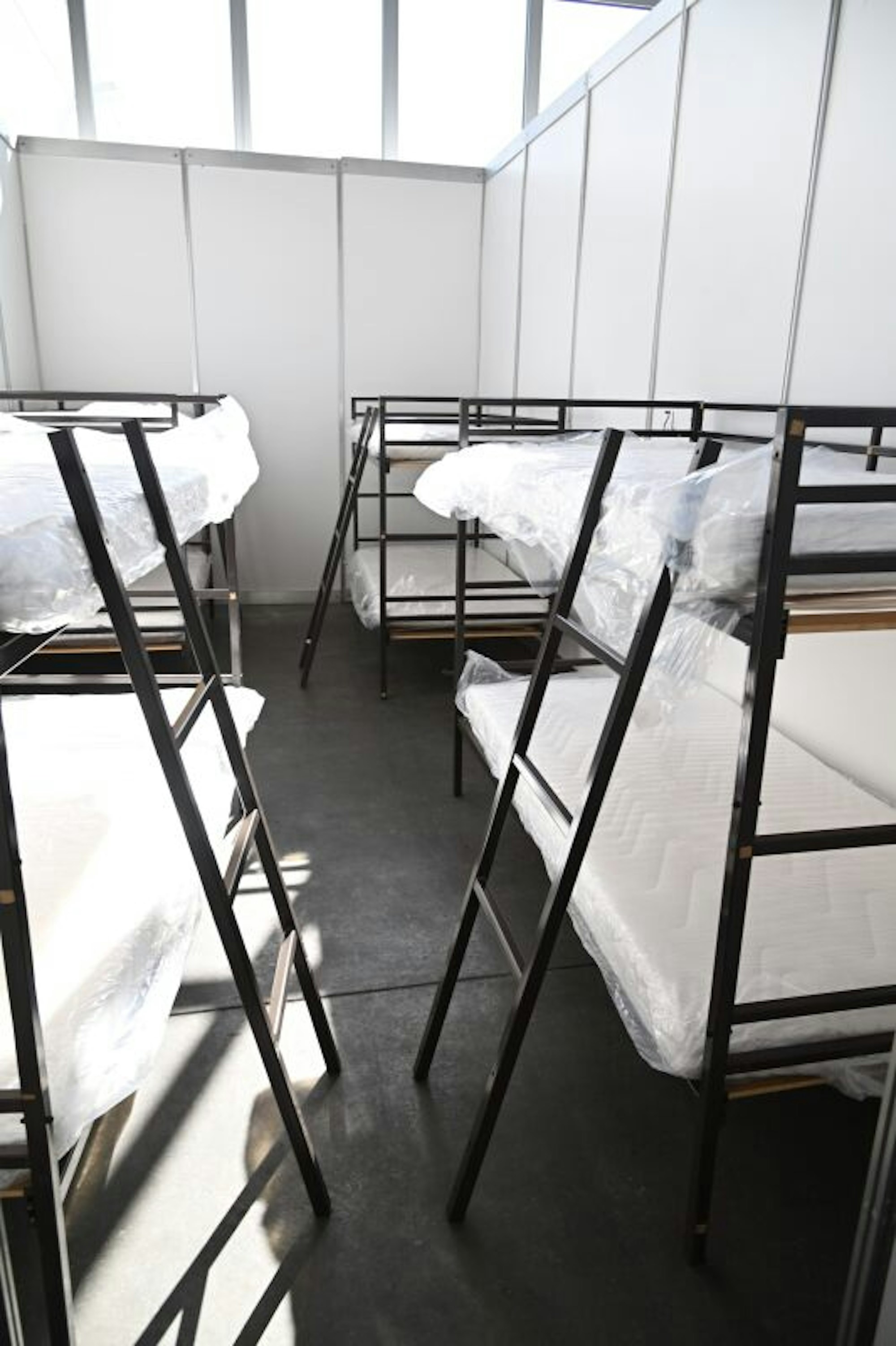 Einzelne Zimmer für Familien sind in der großen beheizbaren Halle von Feuerwehrleuten abgetrennt und mit Betten und Spinden ausgestattet worden.