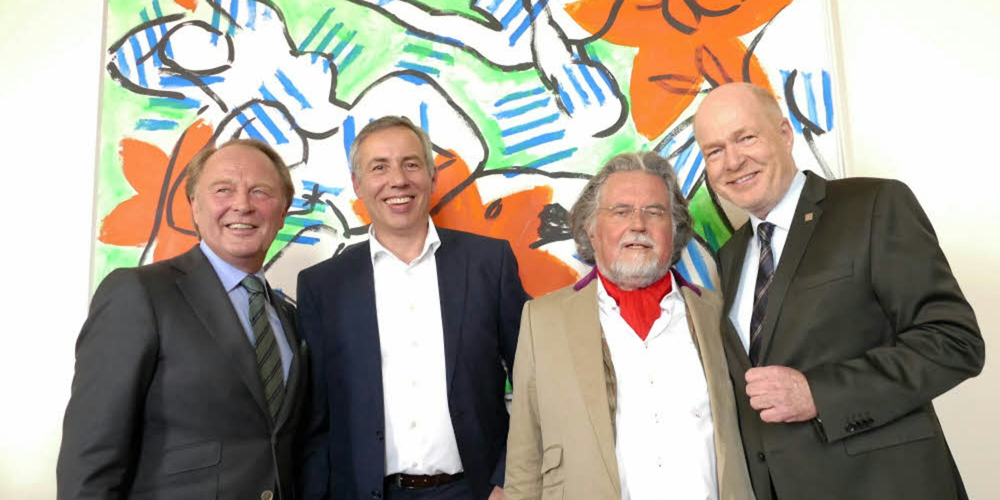Künstler Stefan Szczesny (rotes Tuch) mit Hotelchef Kurt Wagner, Galerist Matthias Kellermann, Hotelier Thomas Althoff (v.l.).