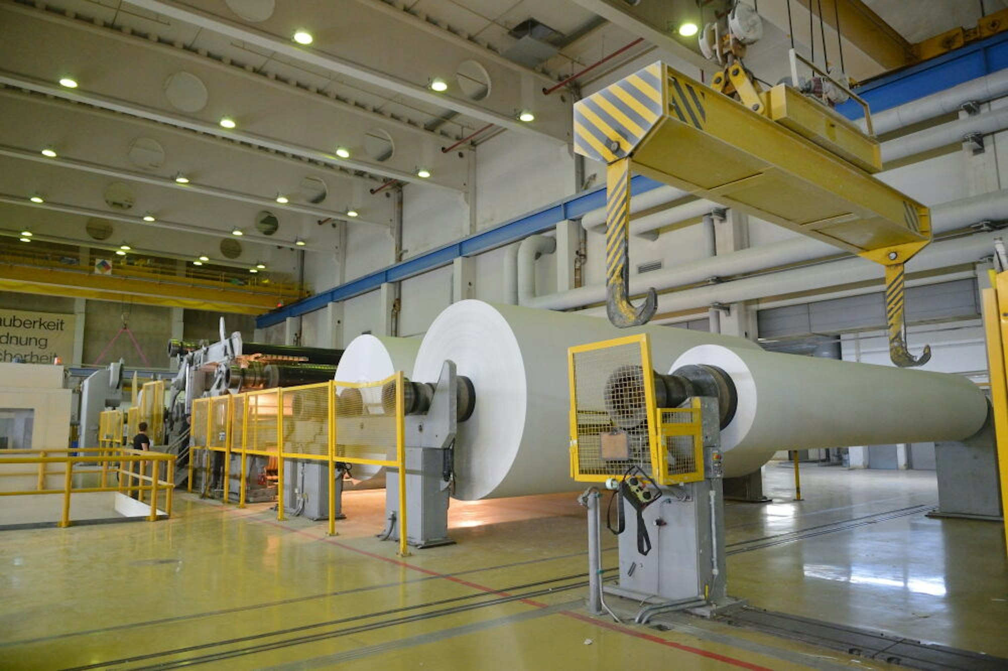 Im Vergleich zu den riesigen Walzen der Papiermaschine 3 wirken diese Papierrollen wie Spielzeug.