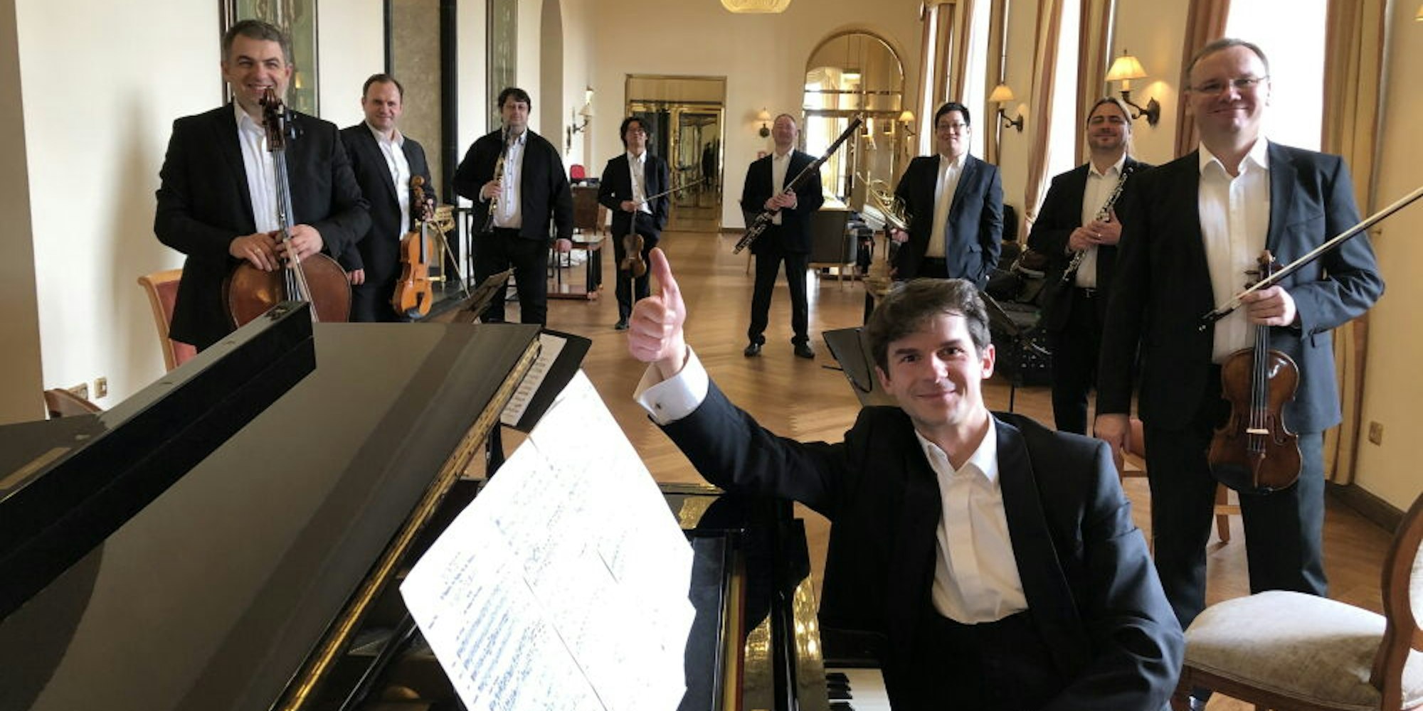 Neun Streicher und Bläser musizieren zusammen unter Leitung des Pianisten Roman Salyutov.