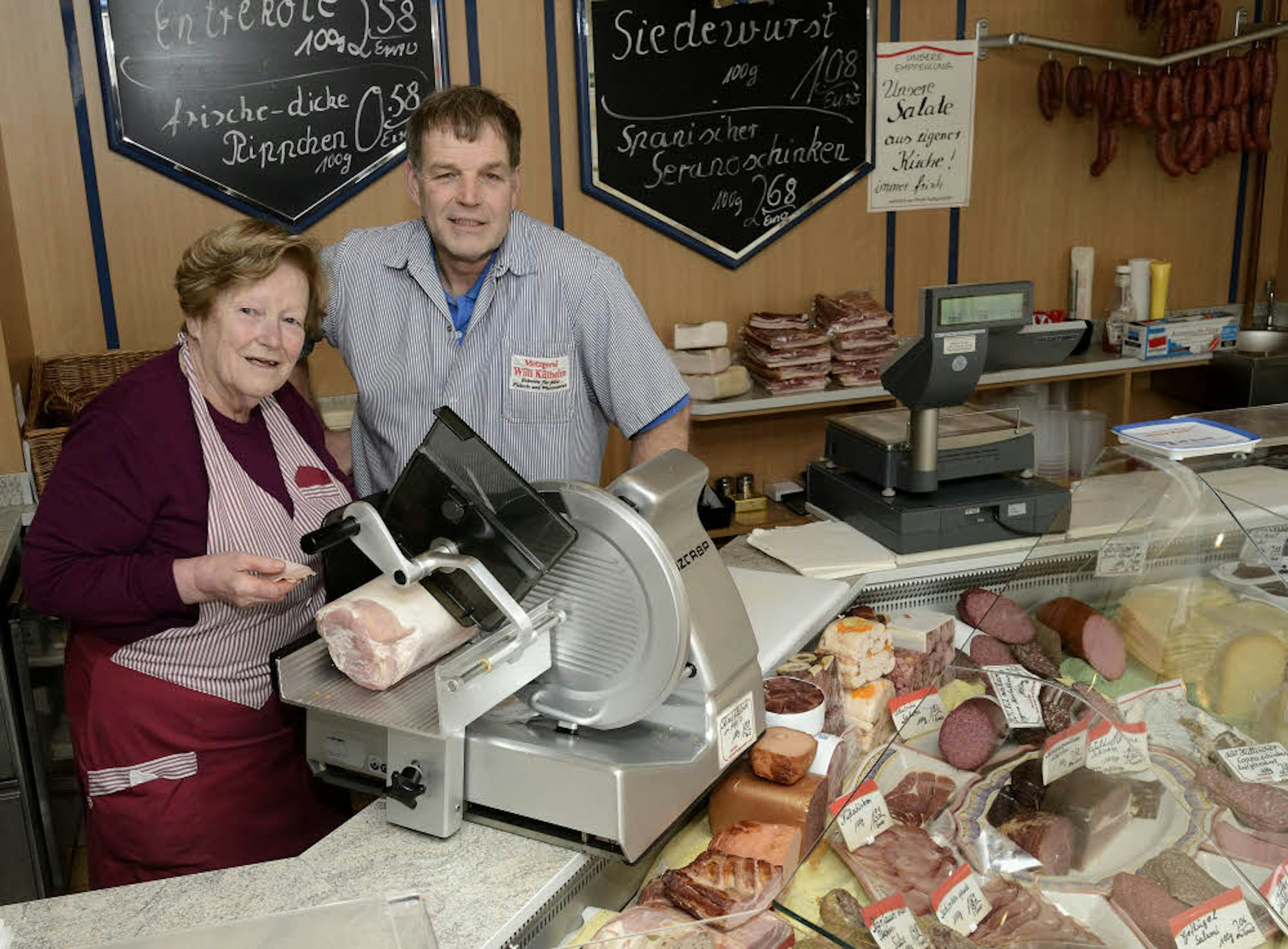 Derweil möchte Josefine Külheim mit 80 Jahren über ihren neuen Lebensabschnitt noch gar nicht nachdenken. „Ich nehme jeden Tag so, wie er kommt“, sagt sie, während sie die Wursttheke für den Verkauf am Nachmittag vorbereitet. Die gebürtige Kölnerin ist gelernte Metzgereiverkäuferin – heute heißt es Fleischerei-Fachverkäuferin – und übernahm 1963 gemeinsam mit ihrem Mann Willi Külheim das Geschäft. Sie bedient bis heute die Kunden. Seit dem Tod ihre Mannes 1997 führt sie den Betrieb mit Unterstützung ihres Sohnes. Vier Mitarbeiterinnen sind in dem Familienbetrieb beschäftigt.