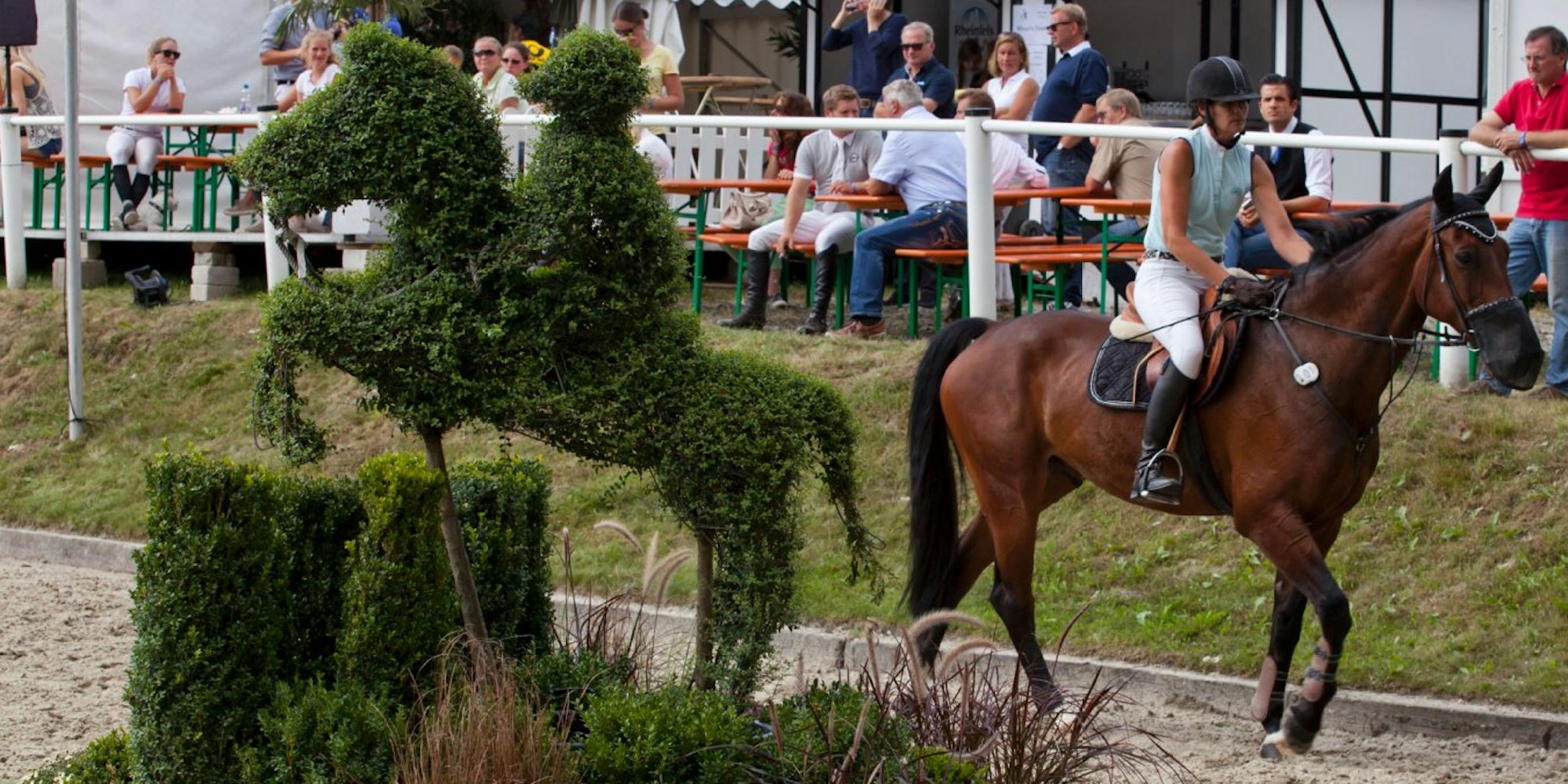 Zunächst geht es auf den Reitplatz der Dressurreiter. Dort machen sich Mensch und Tier gemeinsam warm und bereiten sich mental auf die Prüfung vor. Der Reitplatz ist vom Pferdestall und von einem länglichen weißen Zelt begrenzt. In dem legt „Spooks“ seine Waren aus. „Spooks“ ist ein Geschäft für Reitsportmode mit Sitz in Odenthal. „Luftlinie 500 Meter die Straße rauf“, sagt Peter Dieckmann von „Spooks“.