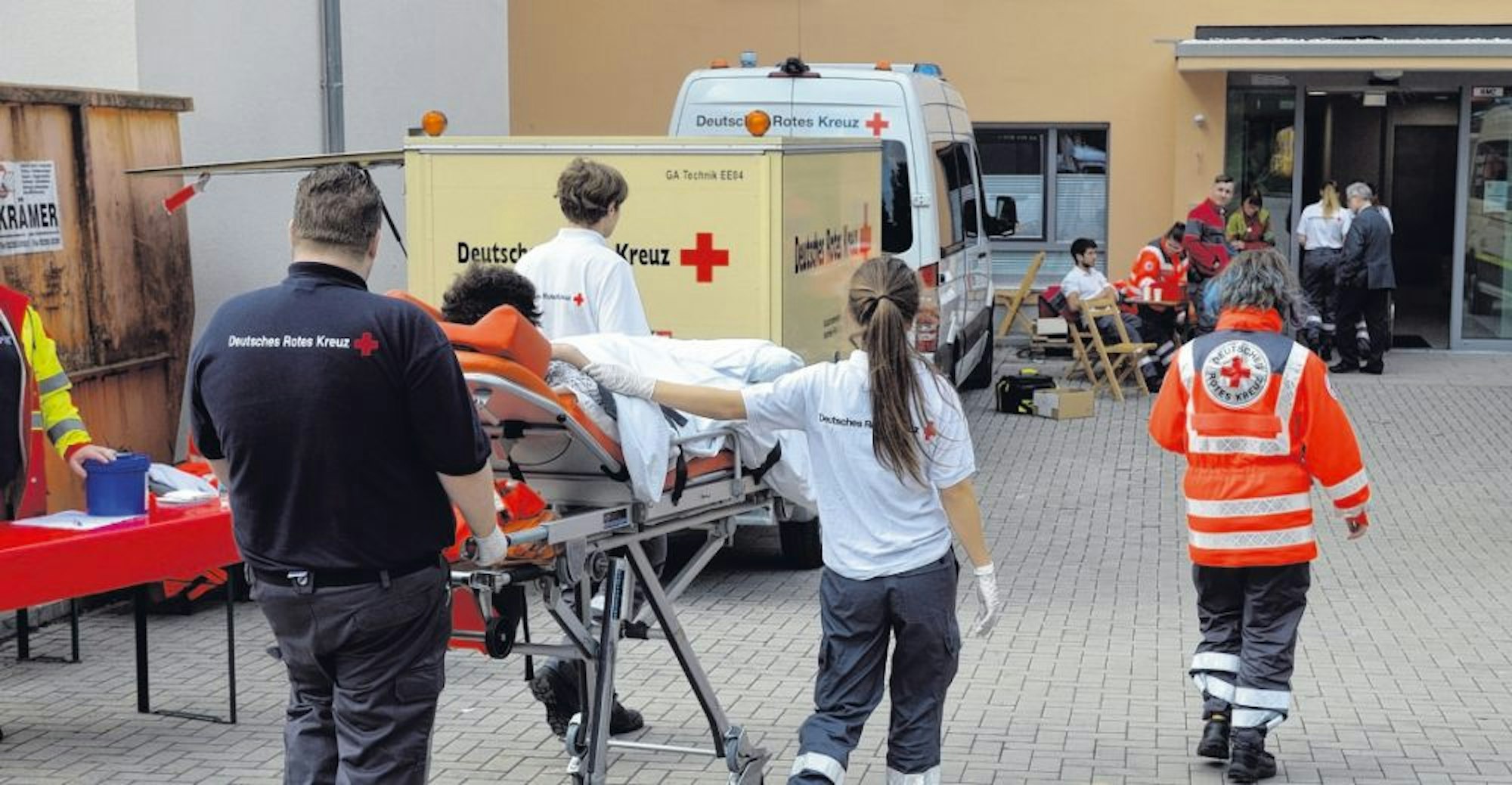 Das Deutsche Rote Kreuz nutzt den Umzug als Evakuierungsübung: Einige Bewohner müssen liegend transportiert werden.