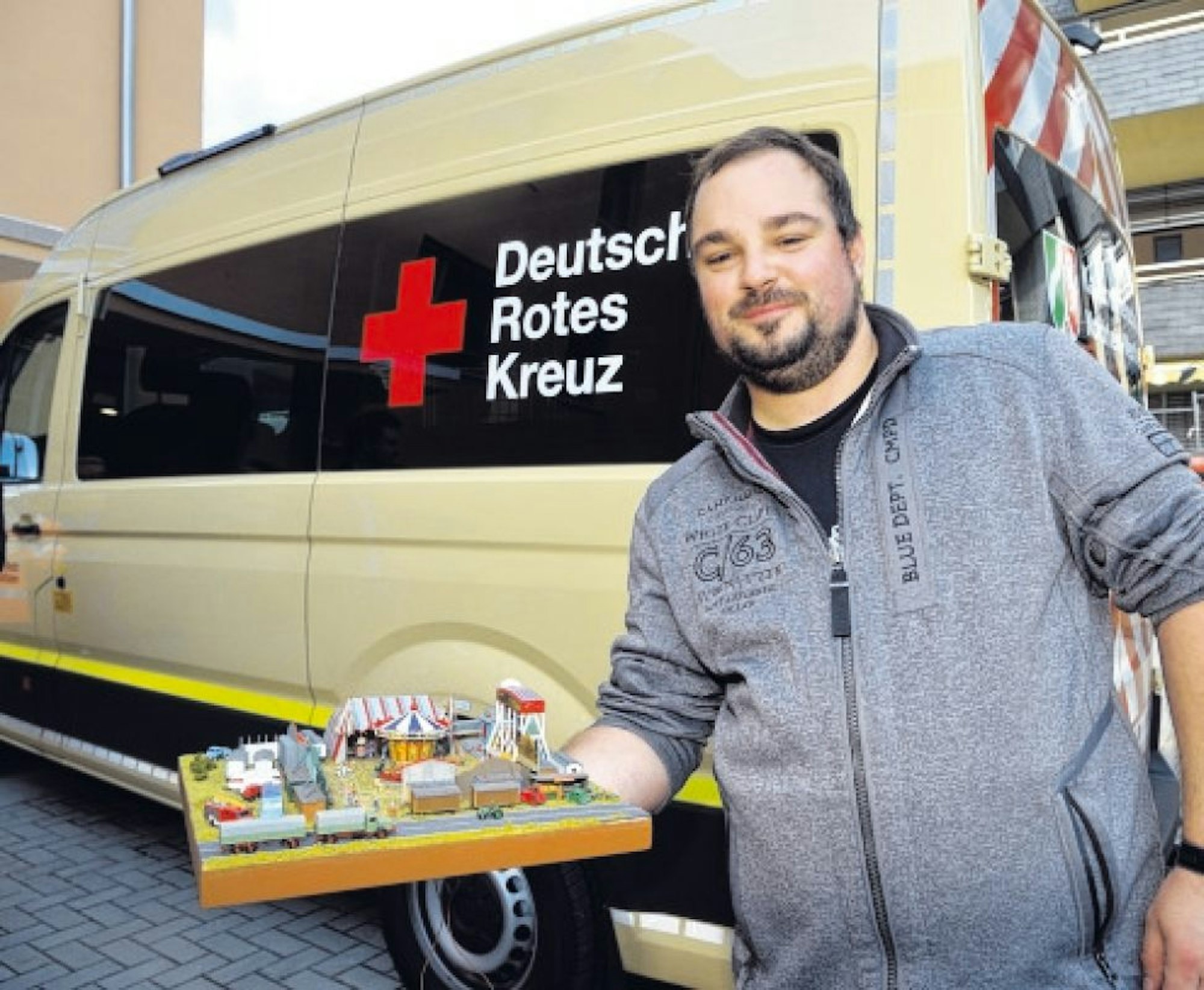 Marco Bauer trägt das Eisenbahn-Modell seines Vaters.
