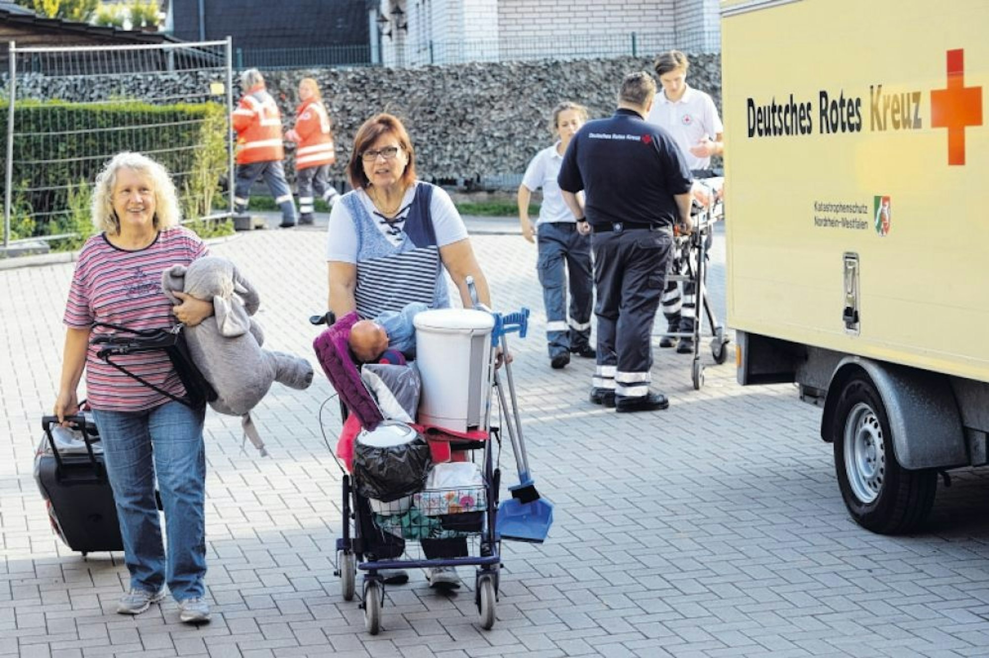 Aufregend ist der Umzug auch für die 30 Helfer des DRK. „Wir nutzen den Umzug als Evakuierungsübung“, erklärt Ingeborg Schmidt, Vorsitzende des DRK-Kreisverbandes Rhein-Berg. „Es ist eine gute Gelegenheit für die jungen Mitglieder zu erfahren, wie man einen Rollstuhl schiebt, was man macht, wenn der Rollstuhl keine Fußstützen hat.“ Und der leicht abschüssige Weg in das neue Haus erfordert Kondition. „Sie lernen mit den Ängsten der alten Herrschaften umzugehen, die sich erst an die Veränderung gewöhnen müssen“, sagt Ingeborg Schmidt. „Wichtig ist es, einen vertrauensvollen Kontakt zu den Menschen zu entwickeln.“ Und so kann man immer wieder beobachten, wie liebevoll und umsichtig die jungen DRK-Helfer die Bewohner transportieren. Auch die 25 Mitarbeiter der Pflegeeinrichtung und zwölf von der Einrichtung am Quirlsberg haben alle Hände voll zu tun.