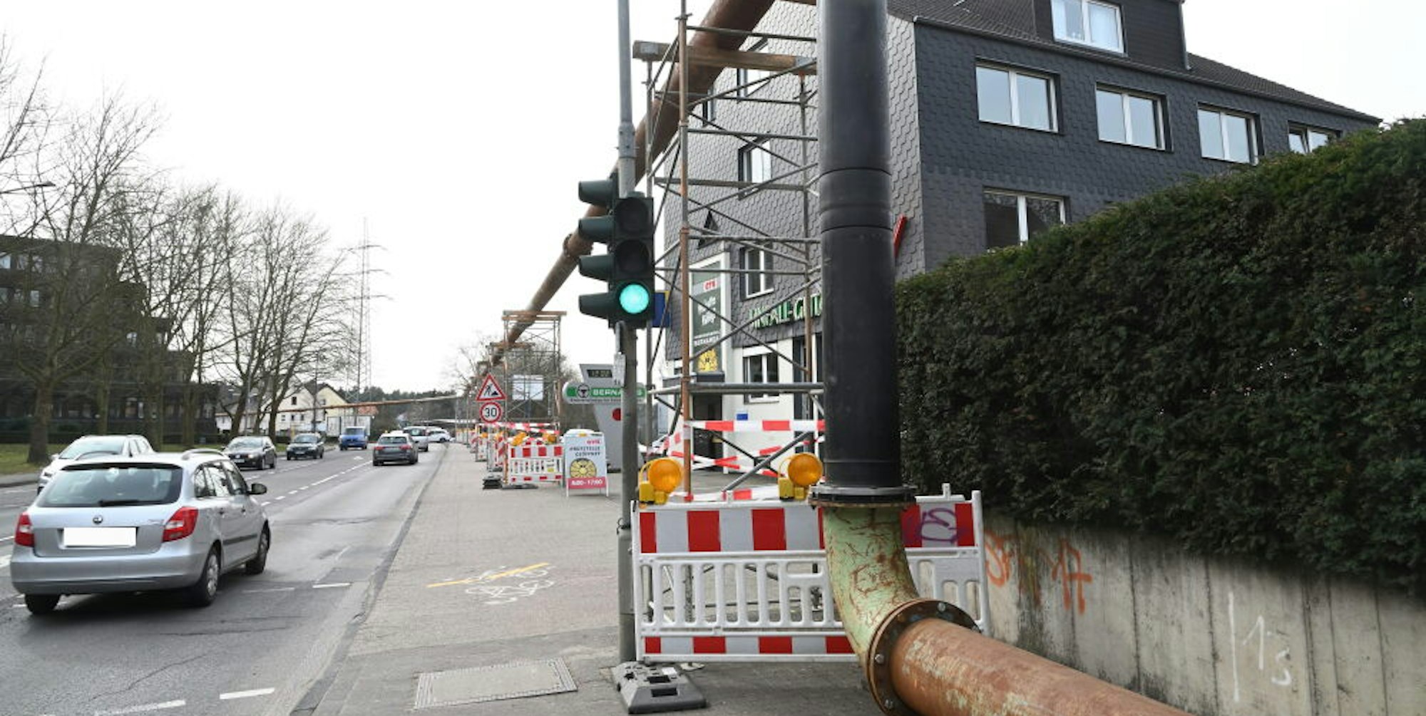 Während am Refrather Weg und Hunderte Meter weiter die Rohre schon aufgebockt sind, ist an der Gierather Straße manches noch in der Vorbereitung. Die Stelzen allerdings, mit denen Straßeneinmündungen und Hauseinfahrten freigehalten werden, stehen bereits. In den nächsten Tagen folgen die Rohre, die über die Hasselstraße und die Alte Marktstraße zu ihrem Ziel am Beningsfeld führen.
